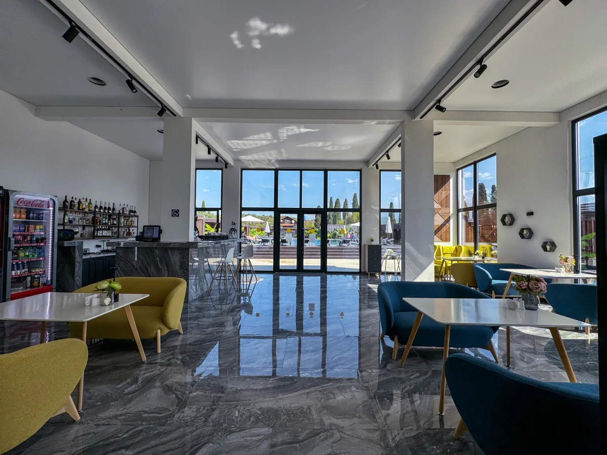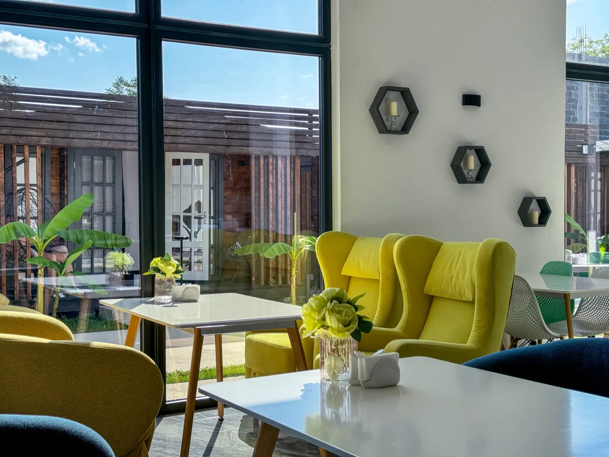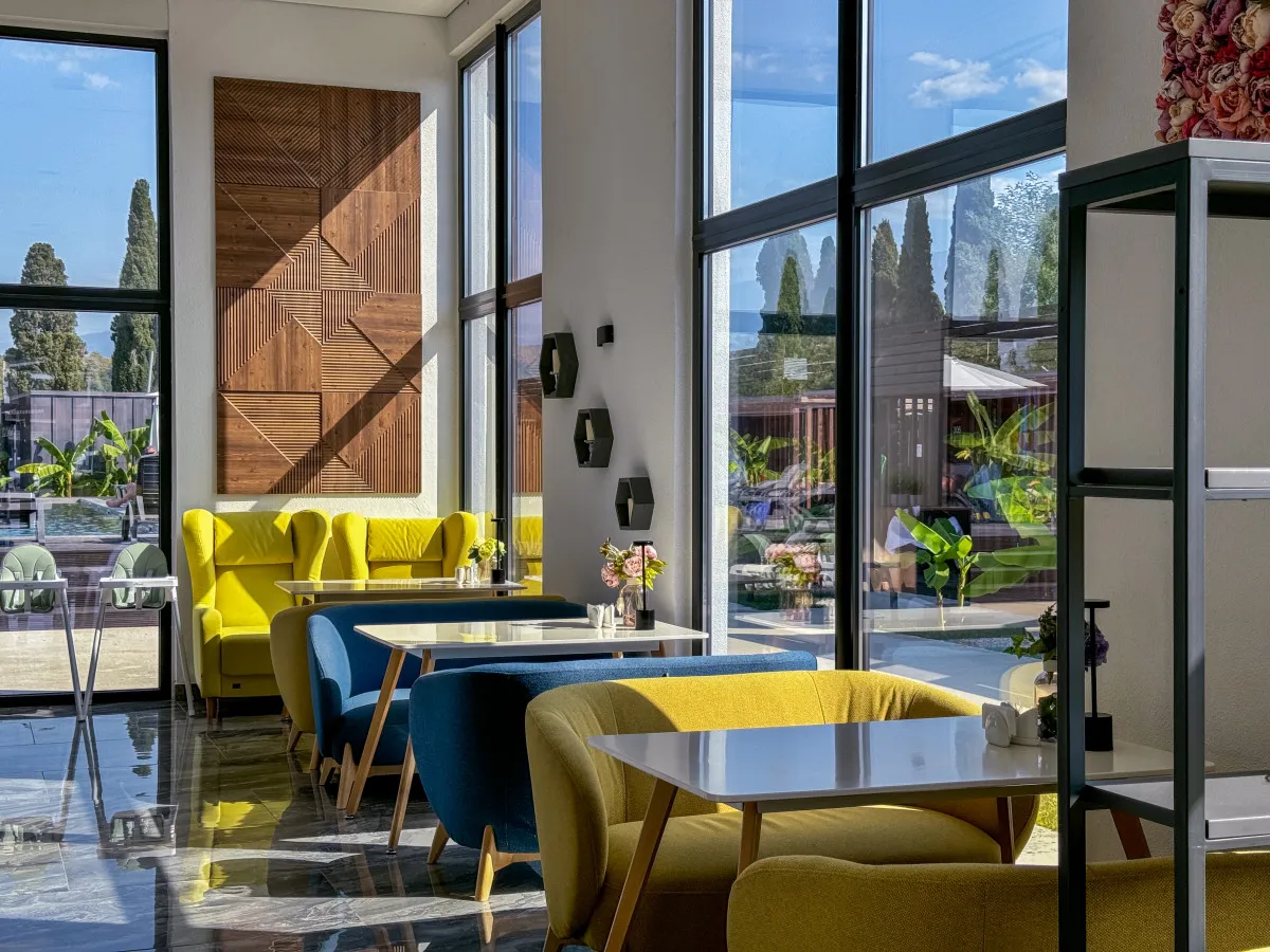 Интерьер отеля выполнен в стиле контемпорари, который впитал в себя идеи разных направлений, от минимализма и ретро до эко и хай-тека. Цветовая палитра обыграна в теплой охре, горчичных, зеленых оттенках и основных успокаивающих серых тонах.