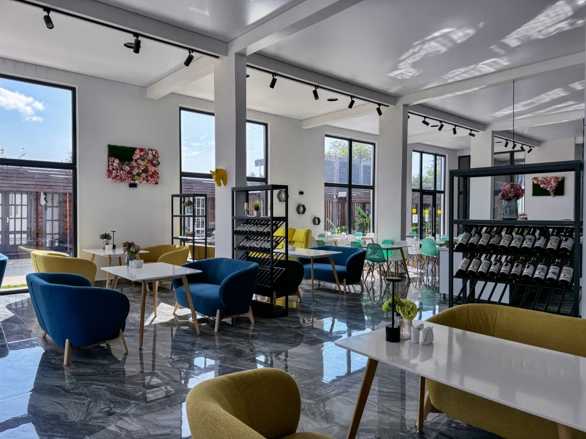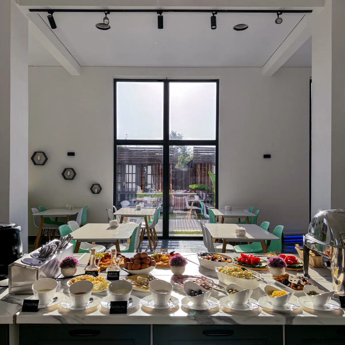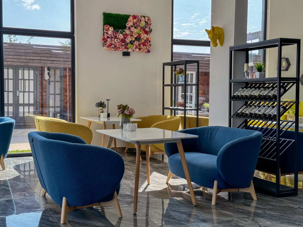 Интерьер отеля выполнен в стиле контемпорари, который впитал в себя идеи разных направлений, от минимализма и ретро до эко и хай-тека. Цветовая палитра обыграна в теплой охре, горчичных, зеленых оттенках и основных успокаивающих серых тонах.
