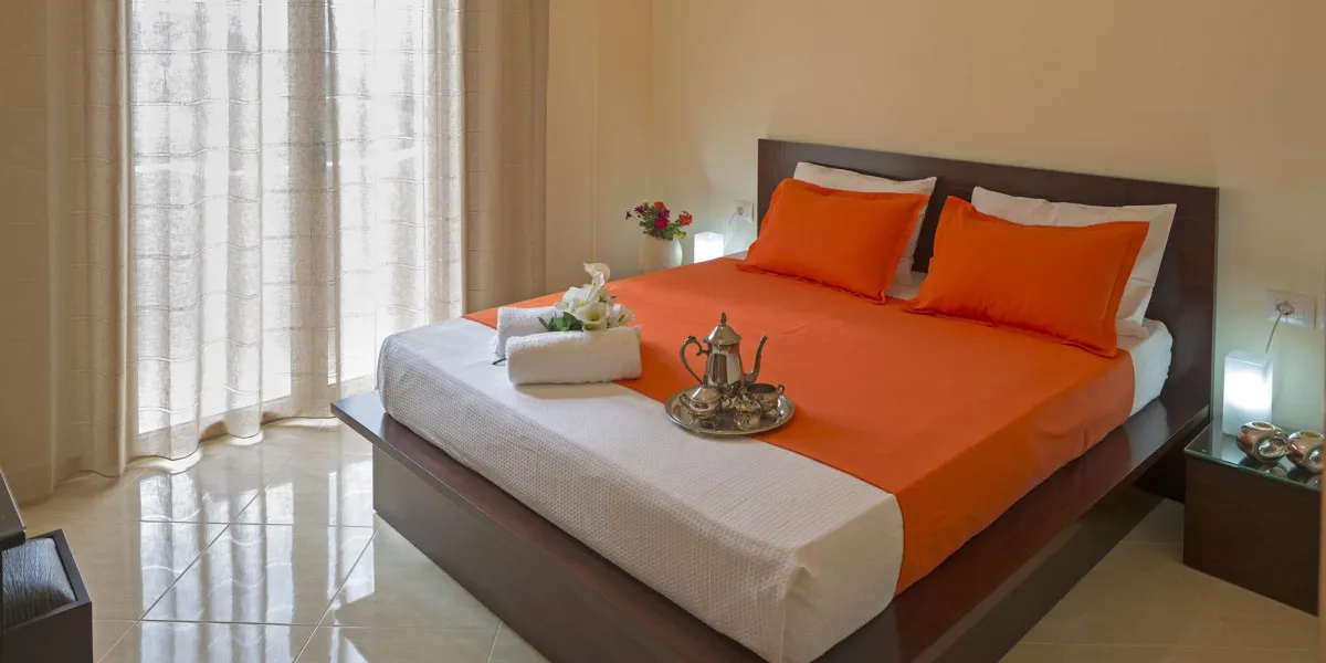 Two Bedroom Apartment With Sea View площадью 100 кв. м., 2 спальни с 1 кроватью размера «king size», 2 односпальными кроватями, диваном-кроватью. Максимальное размещение 5 человек.