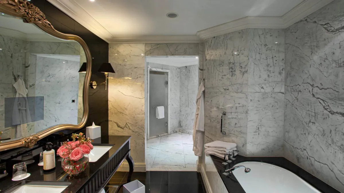 75 м2, номер с кроватью king-size и видом на город. Просторная ванная комната с мраморной отделкой, двойной раковиной, зеркалом со встроенным телевизором, глубокой ванной, отдельной душевой кабиной с тропическим душем, отдельный санузел с биде; гардеробная. Максимальное количество гостей: 3 взрослых и 1 ребенок.
