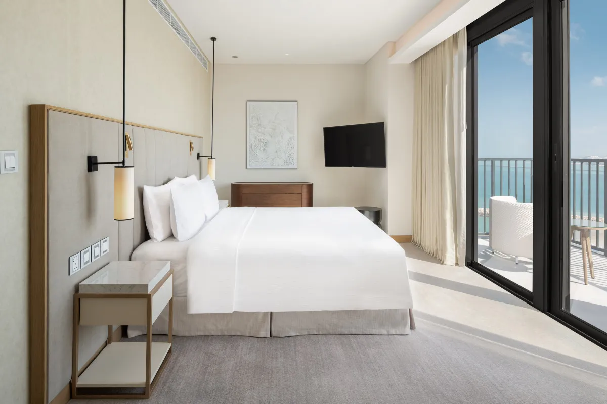 62 м2, номер с видом на море, гостиной, рабочей зоной, одной кроватью king-size и одной детской кроваткой. Максимальное количество гостей: 3 взрослых и ребенок или 2 взрослых и 2 ребенка младше 12 лет.