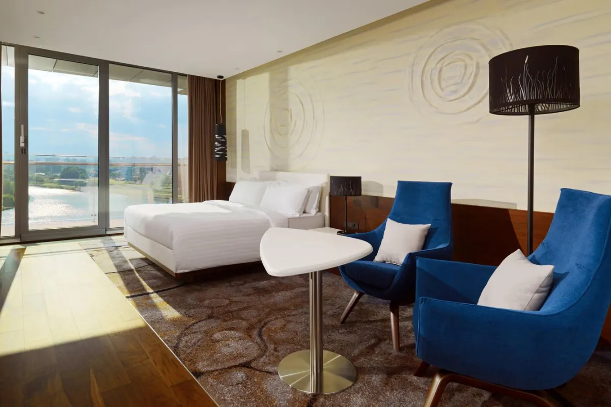 76 м2, двуспальная кровать размера «king-size», отдельная гостиная с раскладным диваном, столовая зона, доступ в лаунж, балкон. Количество гостей: 3