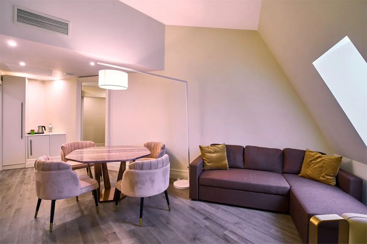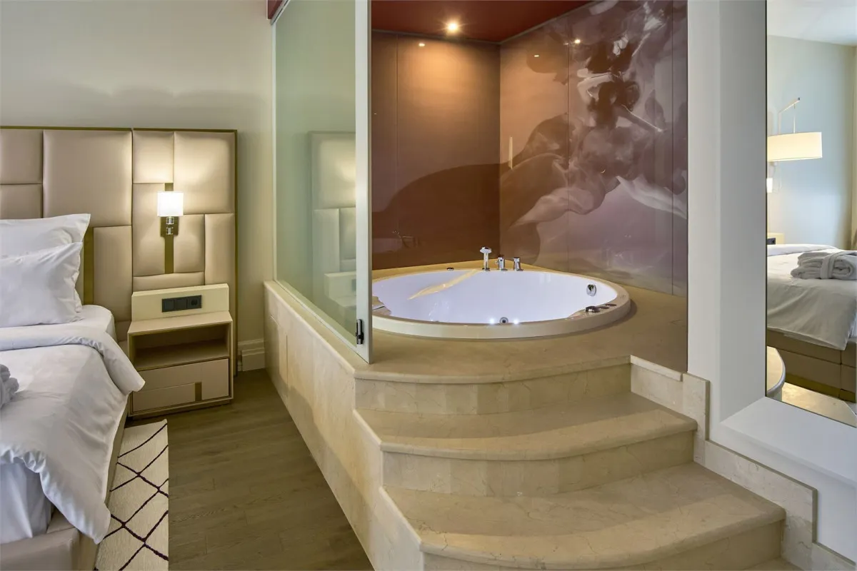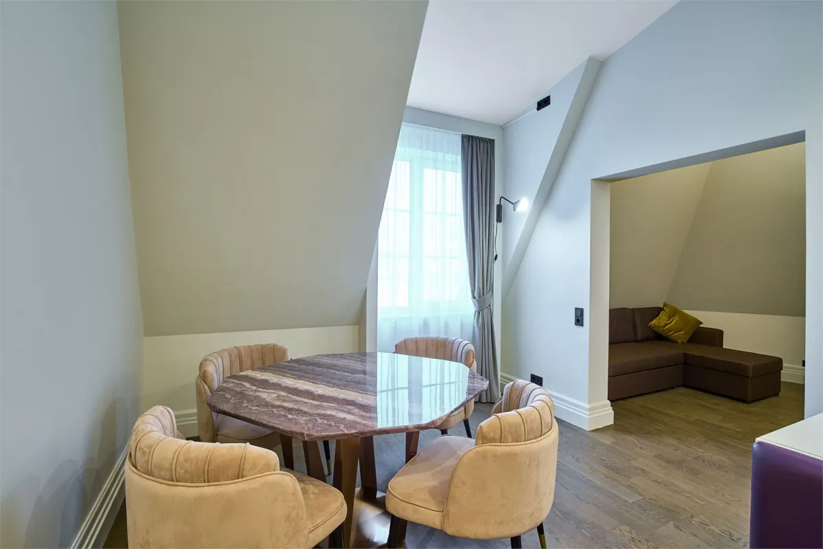 70 м2, двуспальная кровать размера «King-size», отдельная гостиная, обеденная зона, 2 санузла, джакузи, вид на город или на реку. Количество гостей: 4