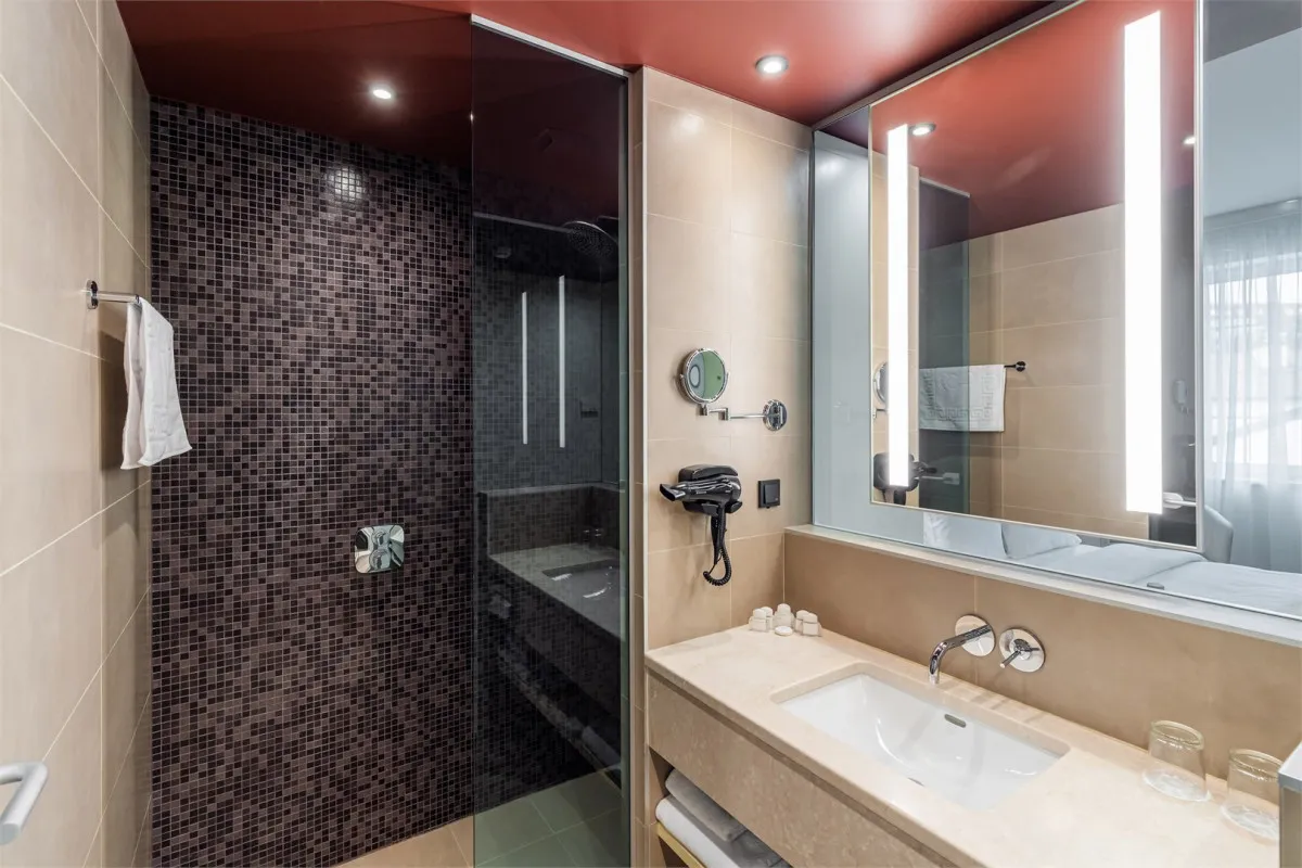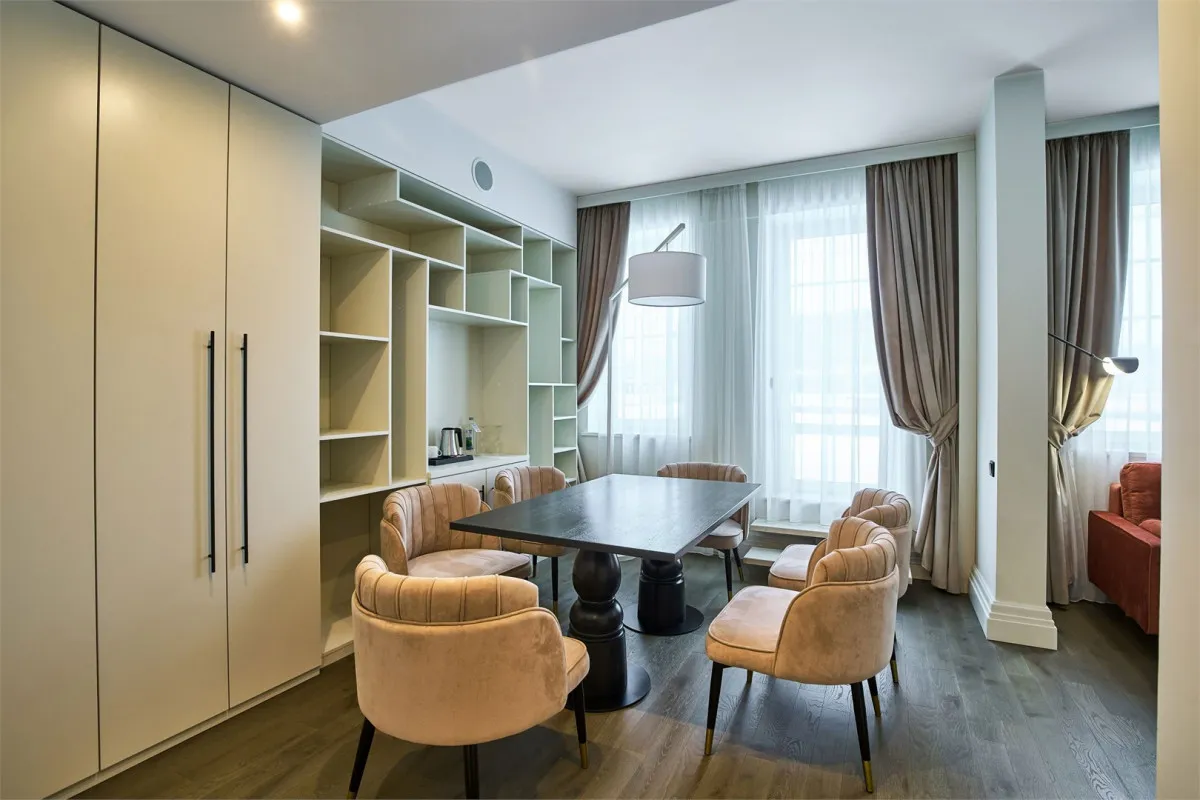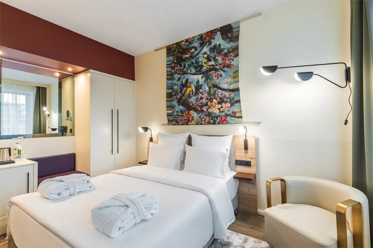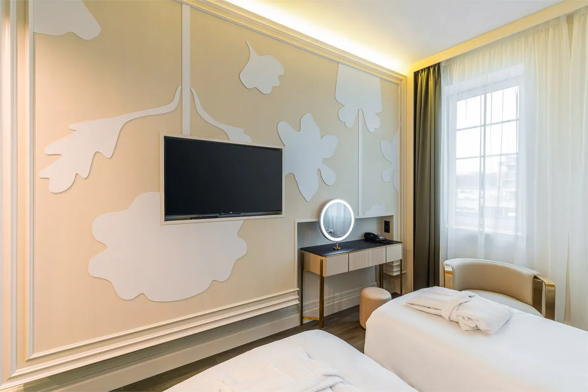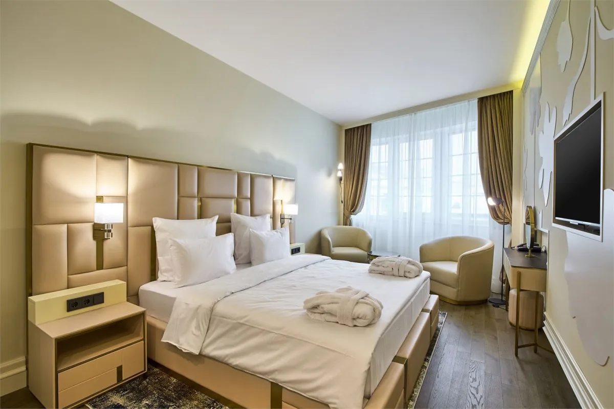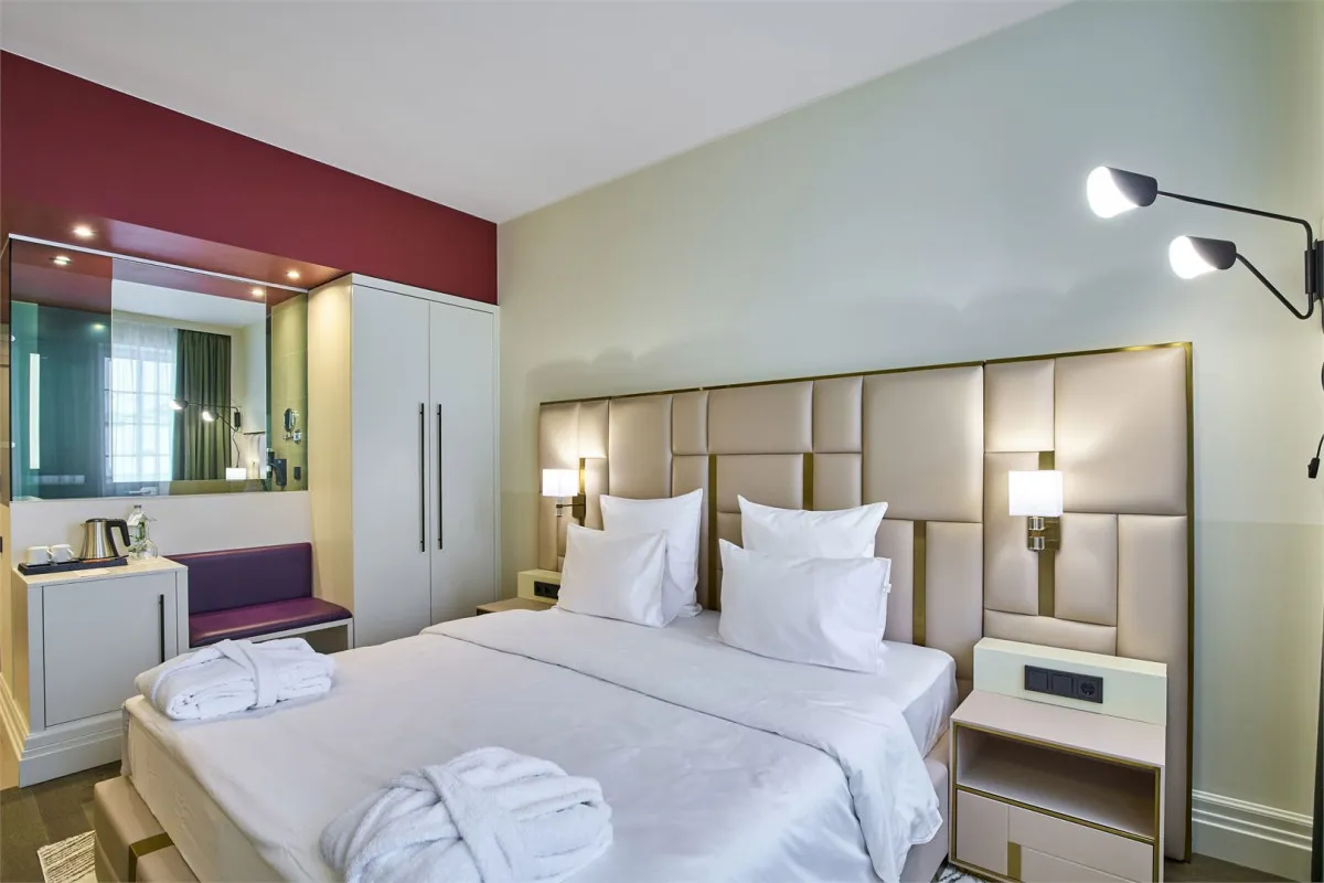 Отель располагает 127 номерами различных категорий, рестораном авторской кухни, баром, конференц-залом и залом для переговоров. Каждый номер оснащен Wi-Fi, LED-телевизором, мини-холодильником, сейфом, феном, набором для приготовления чая, а также тапочками и халатами. Эргономичное рабочее место и удобная кровать с ортопедическим матрасом создают условия для комфортного отдыха и продуктивной работы.