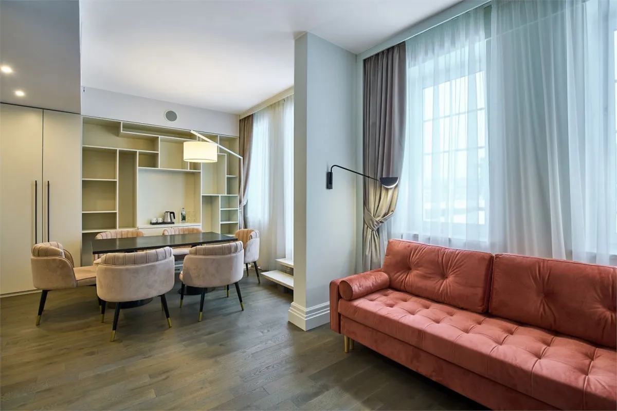 35 м2, двуспальная кровать размера «King-size», отдельная гостиная, вид на город, во двор или на реку. Количество гостей: 4