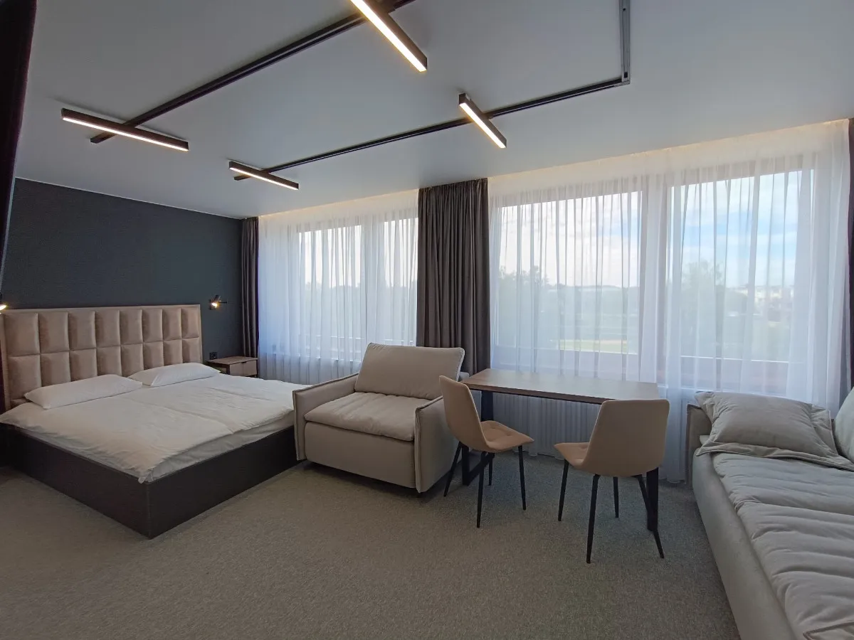16 м2, двуспальная кровать, рабочая зона, вид на центр города