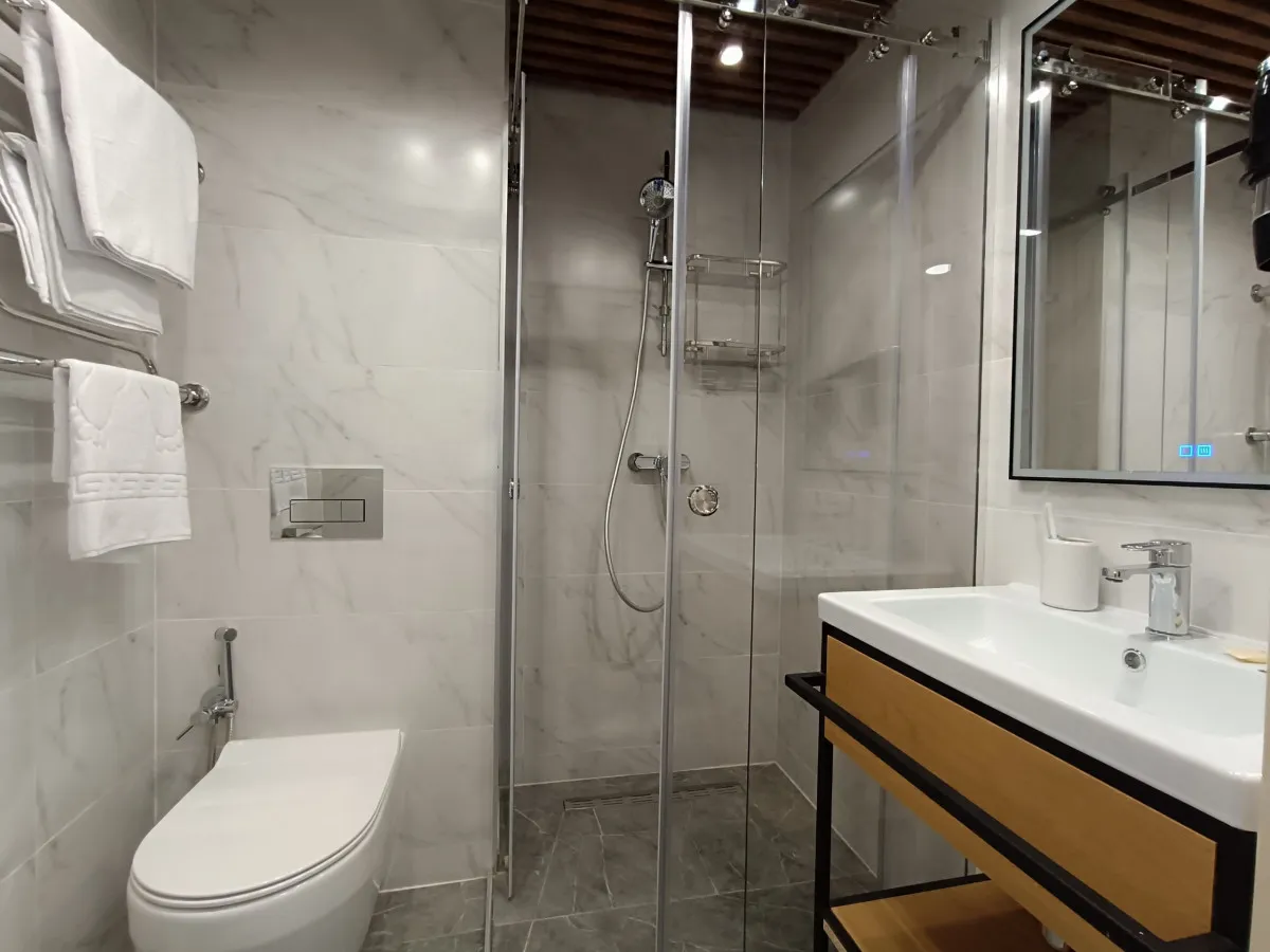 70 м2, двуспальная кровать или две полутороспальные кровати, гостиная с диваном-кроватью, мини-кухня, рабочая зона, лоджия с видом на собор и реку