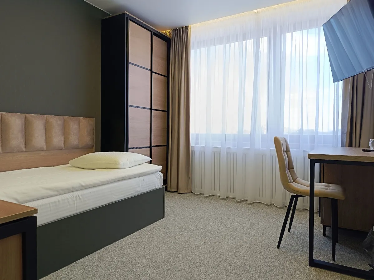 16 м2, односпальная кровать, рабочая зона, вид на центр города