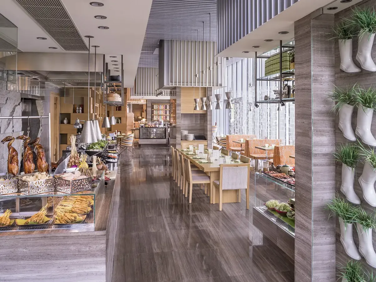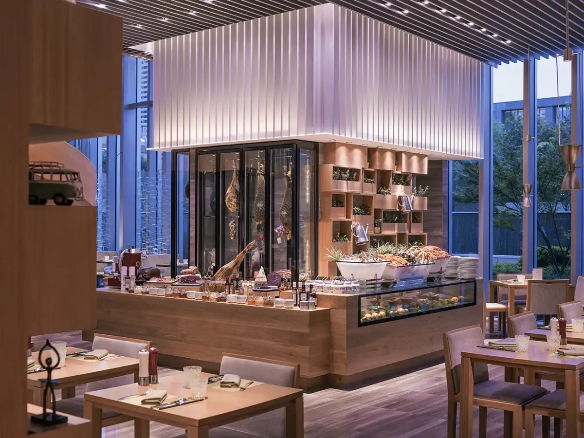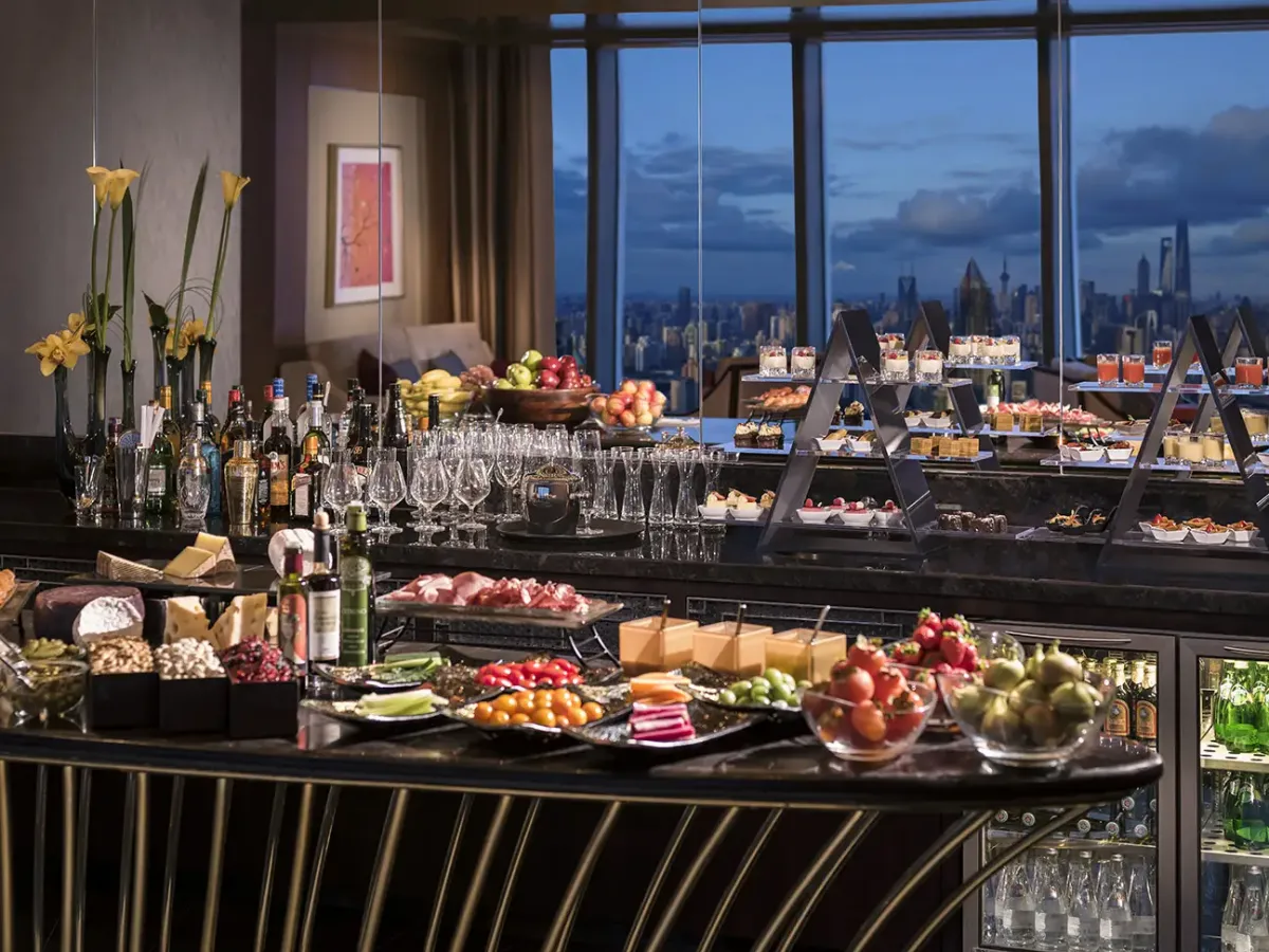 Horizon Club Lounge на 55-м этаже предлагает эффектный вид на город, создавая пространство для отдыха в окружении небесной линии Шанхая. Шесть ресторанов и баров, включая отмеченные Michelin, раскрывают современную интерпретацию кантонской и средиземноморской кухни.