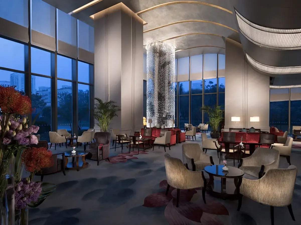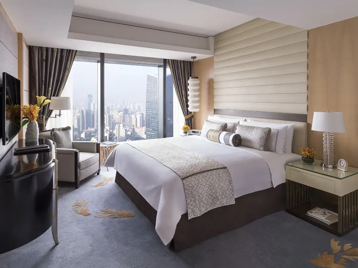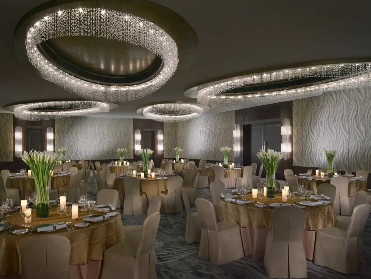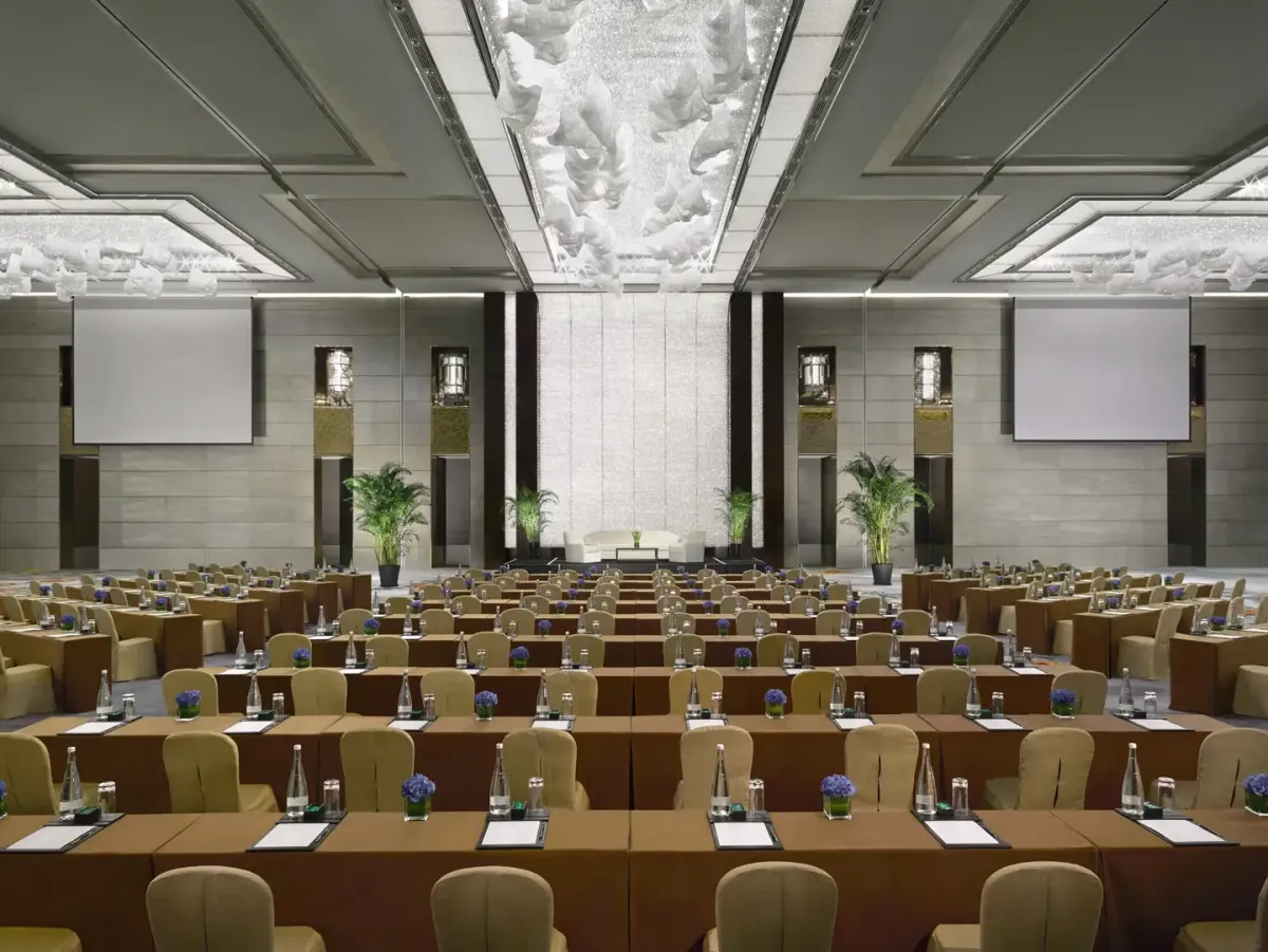 Просторные event-пространства включают большой бальный зал с высокой потолочной архитектурой, зал для торжеств и конференц-залы, подходящие для значимых мероприятий. Доступность аэропорта Хунцяо за 20 минут и международного аэропорта Пудун примерно за 45 минут подчеркивает удобство расположения.