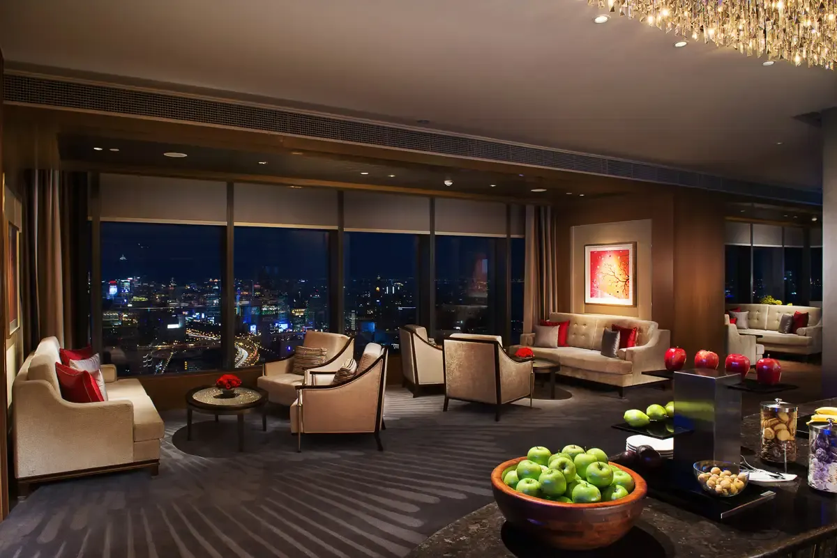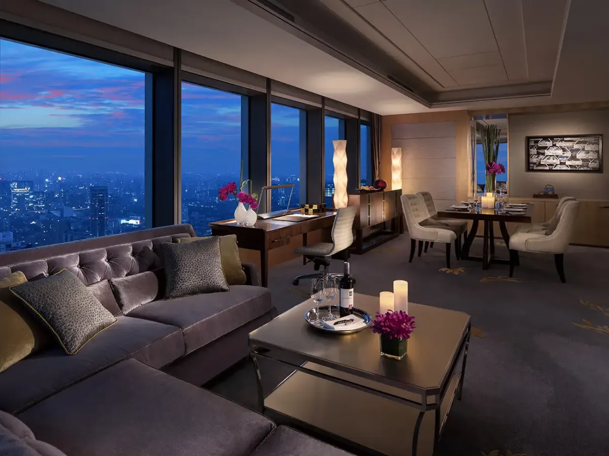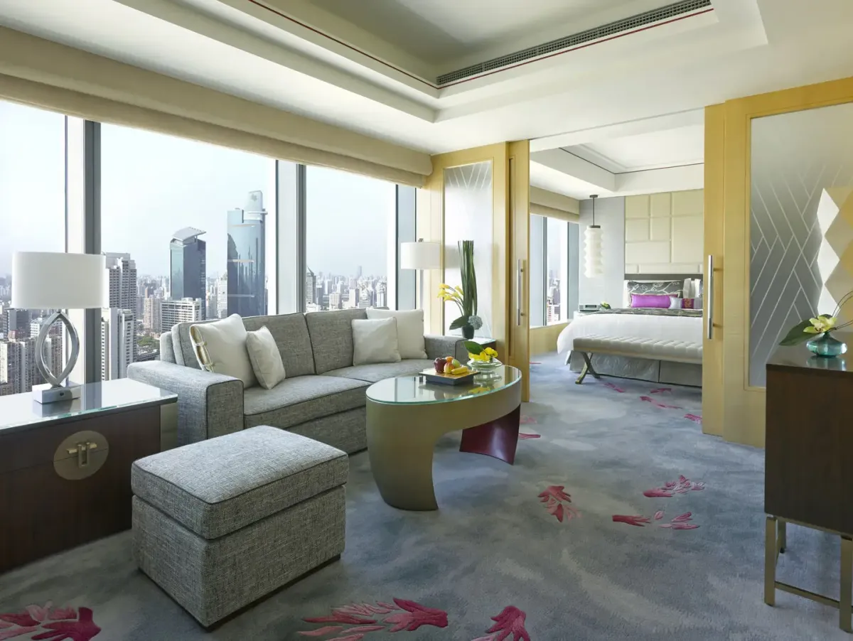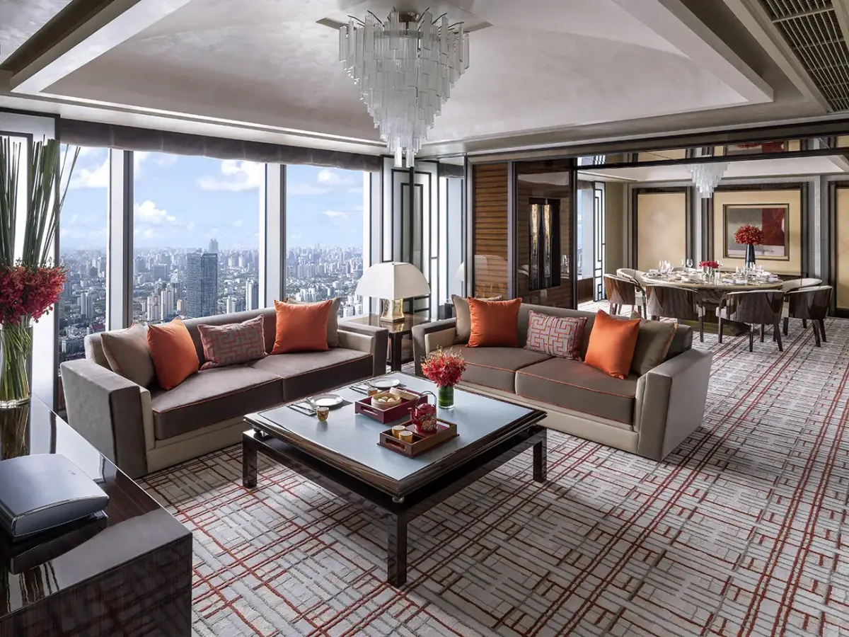 311 м2, двуспальная кровать размера «king-size», отдельная гостиная, столовая, мини-кухня, кабинет, услуги личного дворецкого, клубные привилегии, окна от пола до потолка, панорамный вид на Шанхай