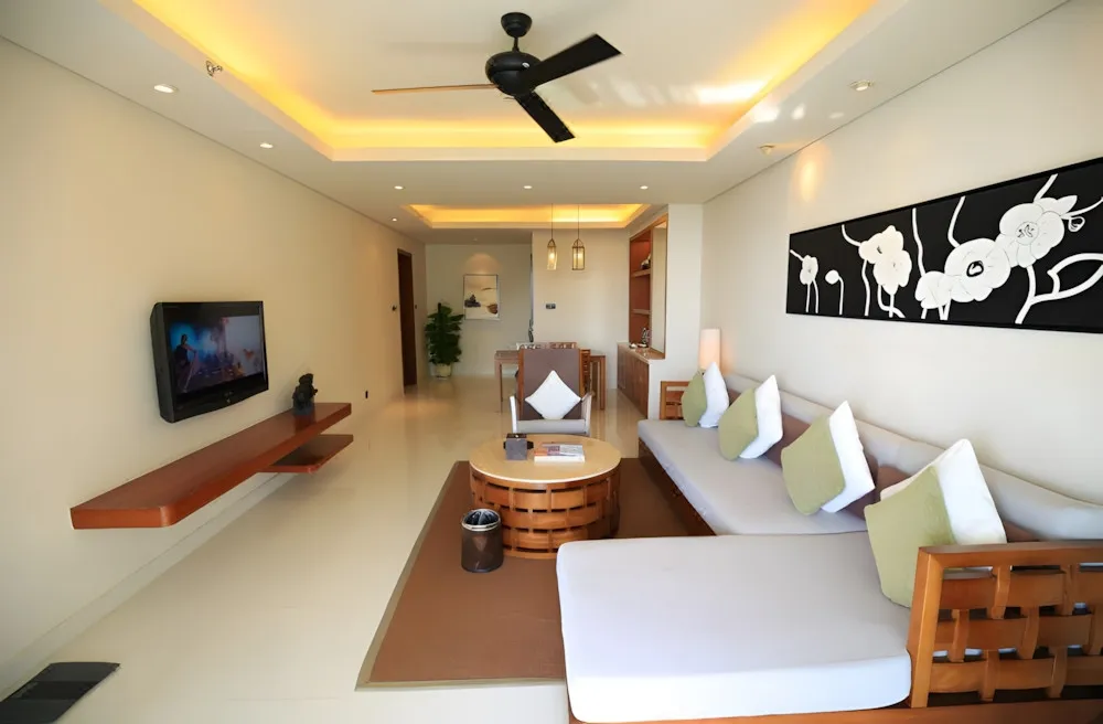 85 м2, люкс с видом на сад или море, одной спальней, двумя односпальными кроватями, отдельной гостиной, балконом. Максимальное количество гостей: 4.