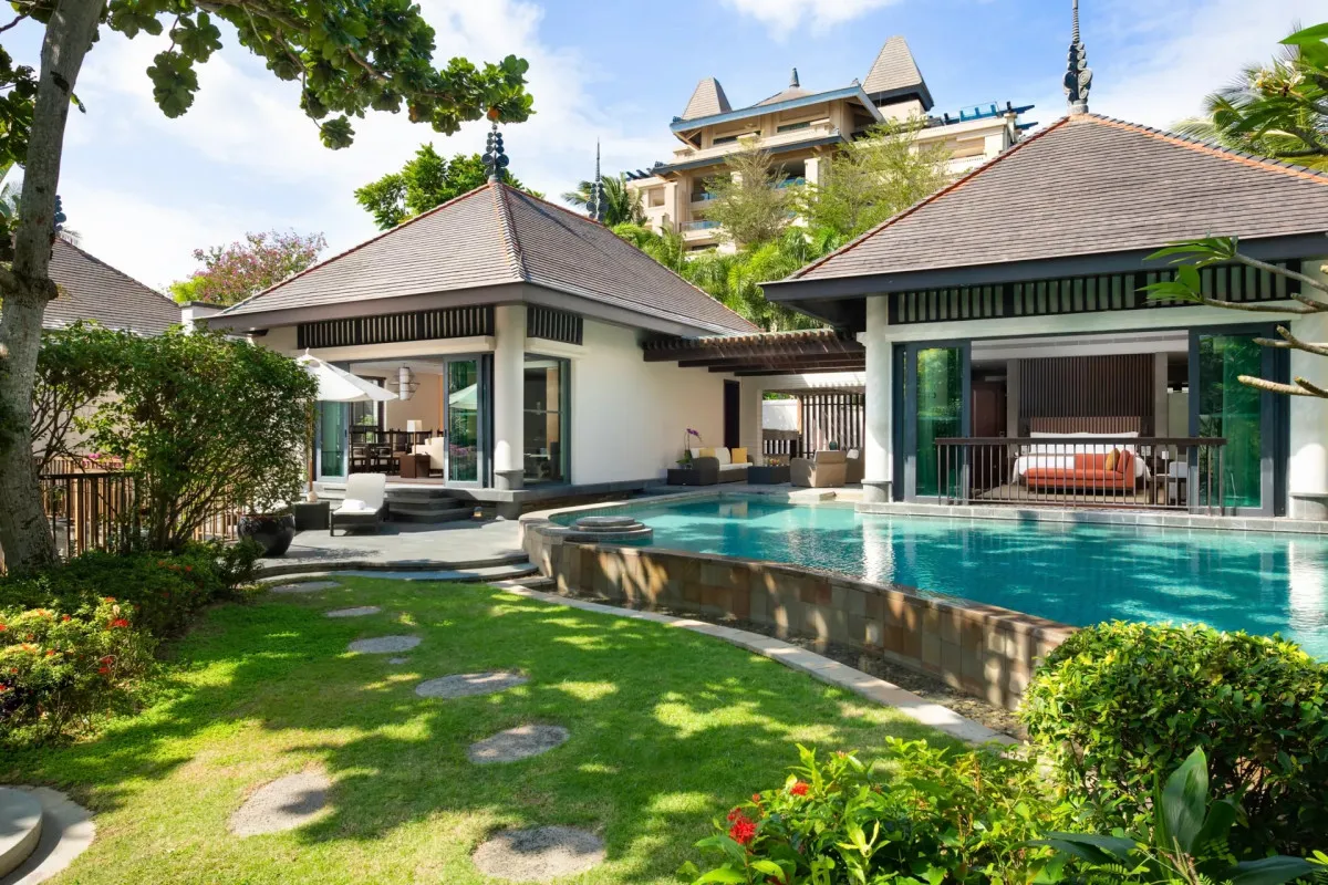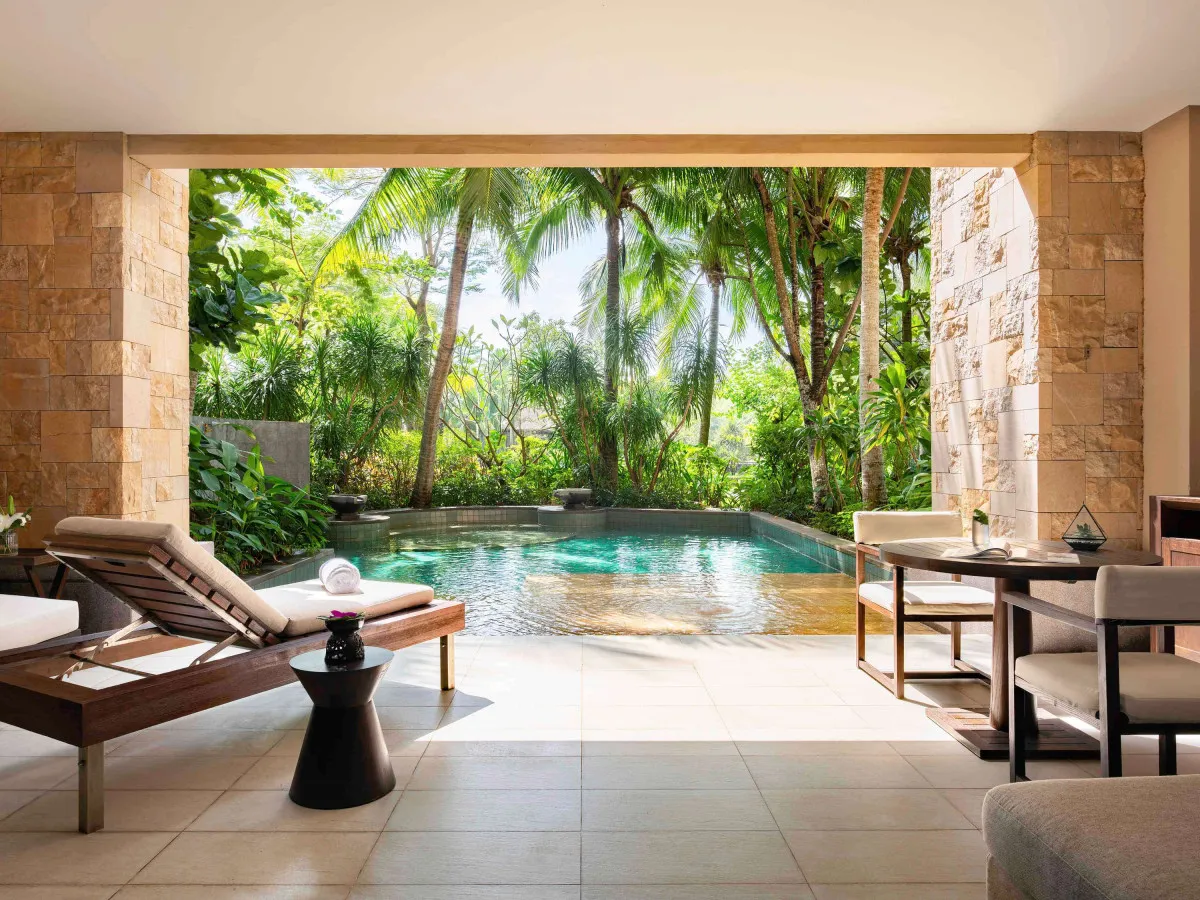80 м2, терраса с видом на сад и собственным бассейном, две кровати queen-size. Максимальное количество гостей: 3.