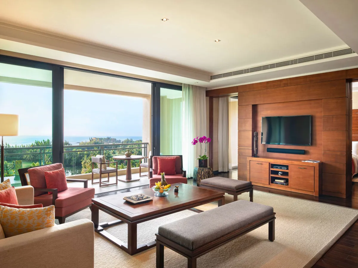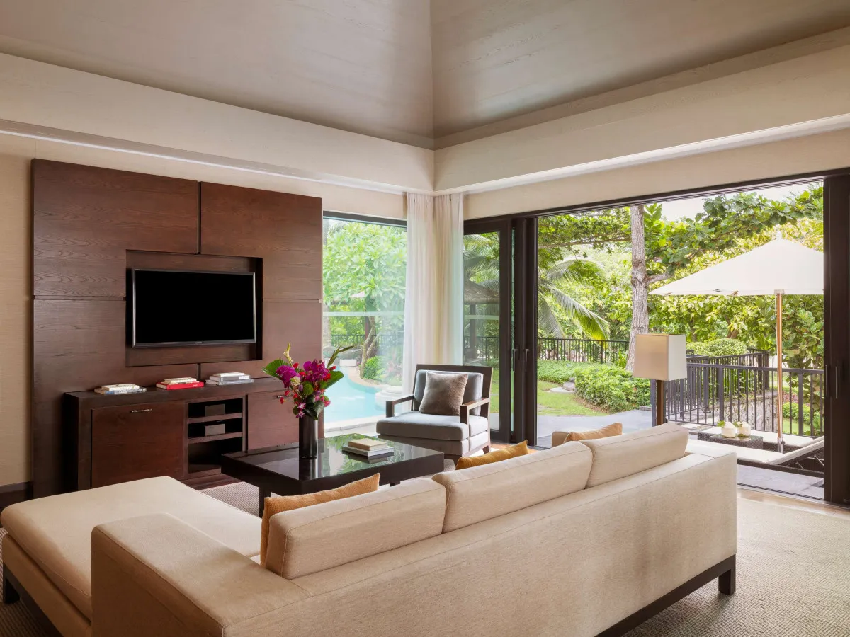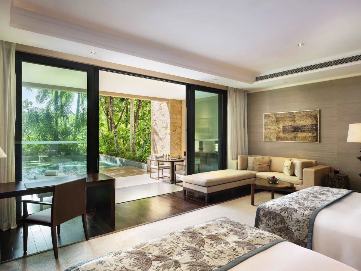 Отель Raffles Hainan Clear Water Bay универсален: он подойдет и для семейного отдыха, и для деловой поездки на конференцию, и для романтического отпуска на двоих. Его территория окружена пальмами и тропическим лесом.