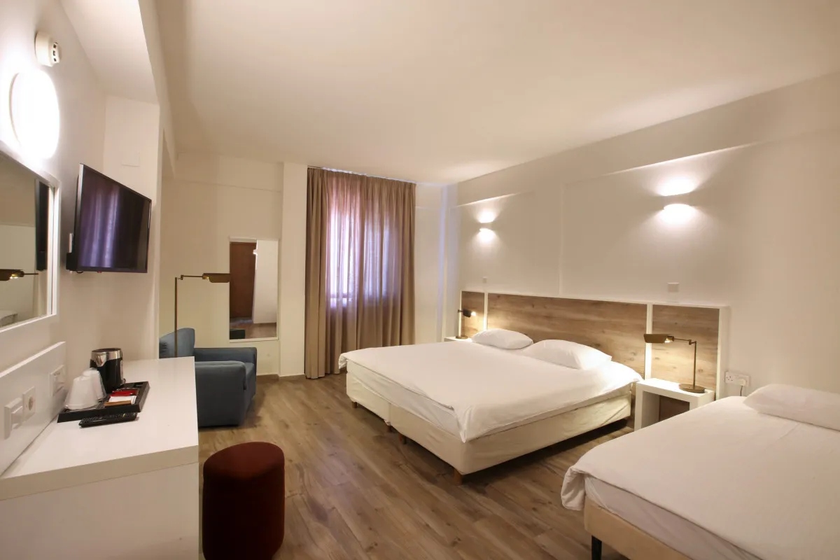 большая спальная зона с кроватью размера king-size/ двуспальной кроватью и двумя односпальными кроватями