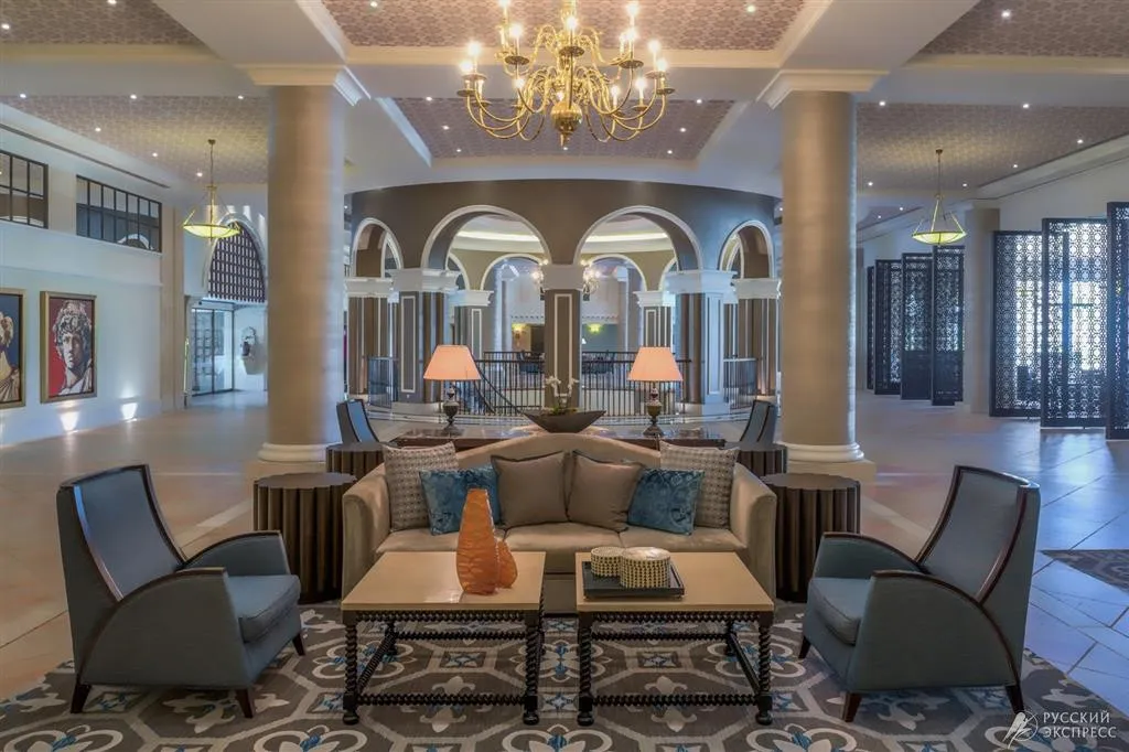 Архитектура и дизайн отеля Elysium 5* на Кипре создают атмосферу роскоши и спокойствия. Территория окружена обширными ландшафтными садами, которые дополнены многоуровневыми бассейнами, амфитеатром и величественными колоннадами. В оформлении преобладают элементы, напоминающие об истории и наследии острова: мозаики, водопады, а также мастерская обработка камня, мрамора и дерева.