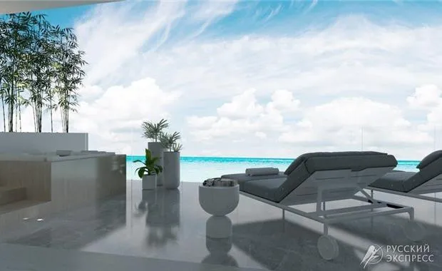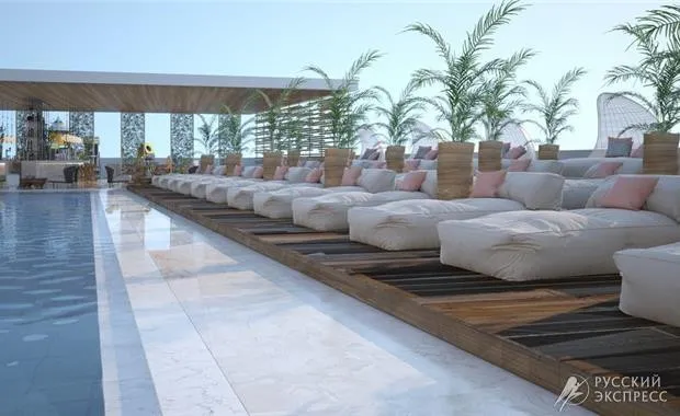- терраса для загара с шезлонгами и зонтами