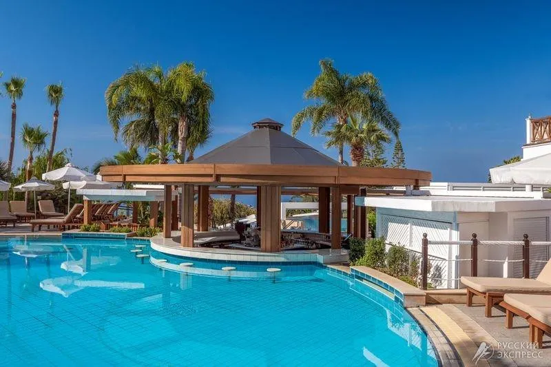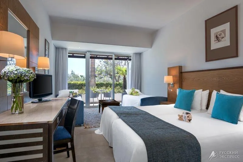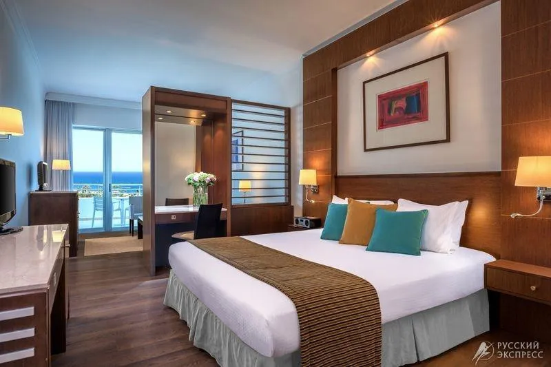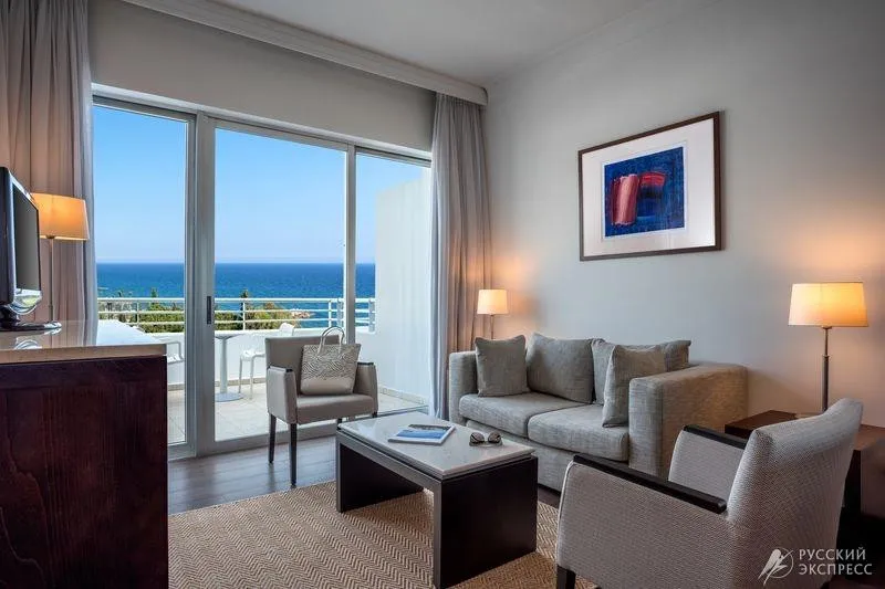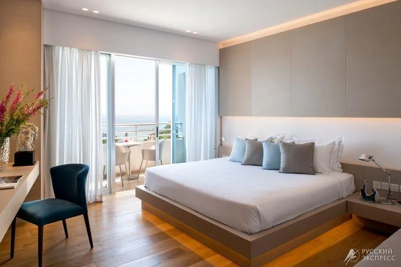 75 м2, с видом на море на 5 этаже отеля, гостиная, спальня, большая ванная комната, гостевой туалет, 2 балкона, 2 ТВ, 2 большие двуспальные кровати, wi-fi, элегантная мебель и интерьер номера, выдержанный в кипрском стиле, максимальное размещение 2 взрослых