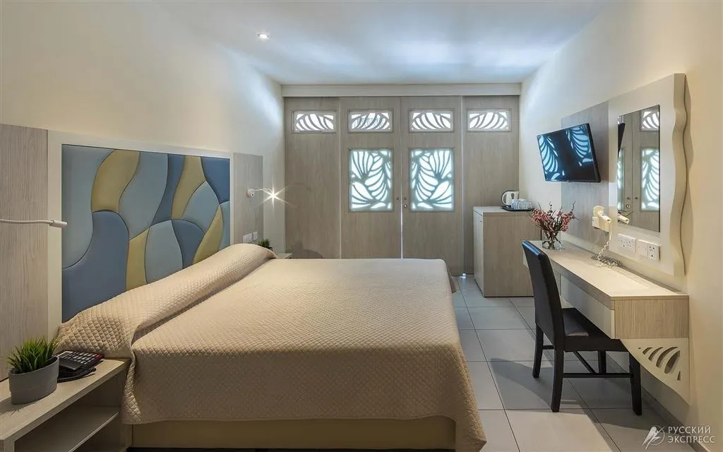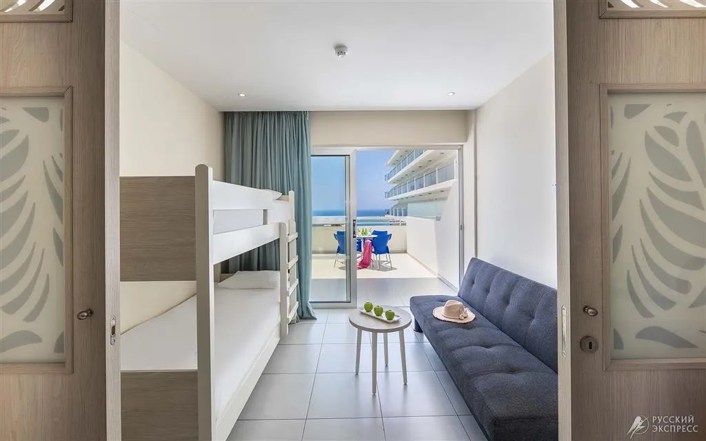 42 м2, в апартаментах 1 спальня с 2 односпальными кроватями, 2 дополнительными кроватями и 1 детская кроватка в гостиной. Количество гостей: 2 взрослых/ 4 взрослых/ 2 взрослых + 3 детей