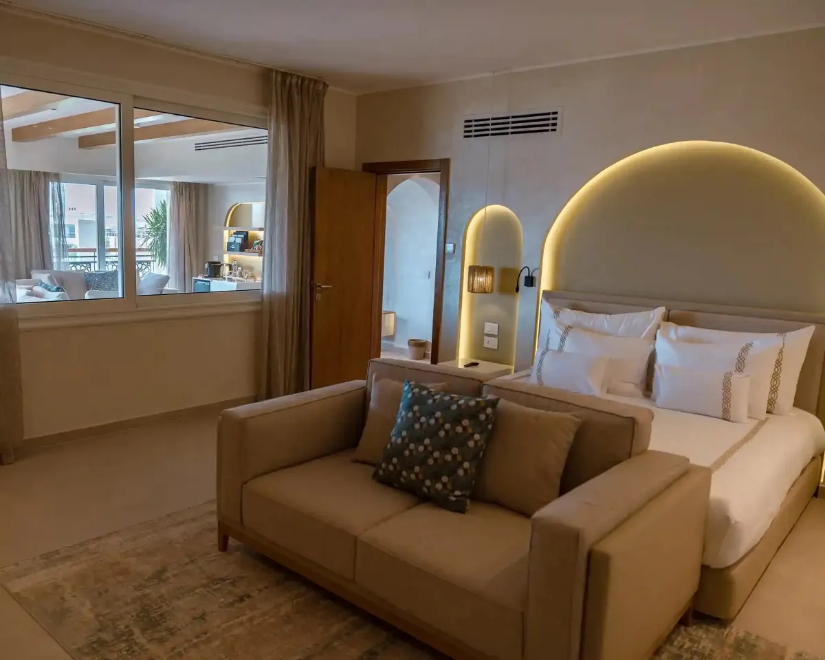 62 м2, 2-этажный люкс: балкон, вид на море, спальня (двуспальная кровать) и ванная комната на 2 этаже, гостиная и ванная комната на 1 этаже. Количество гостей: 2 взр.