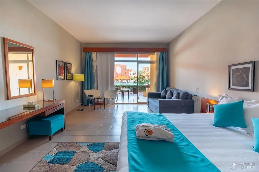45–50 м2, однокомнатный номер с зоной отдыха, с двуспальной кроватью, вид на бассейн/ частично на море, балкон/ терраса, есть халаты и тапочки