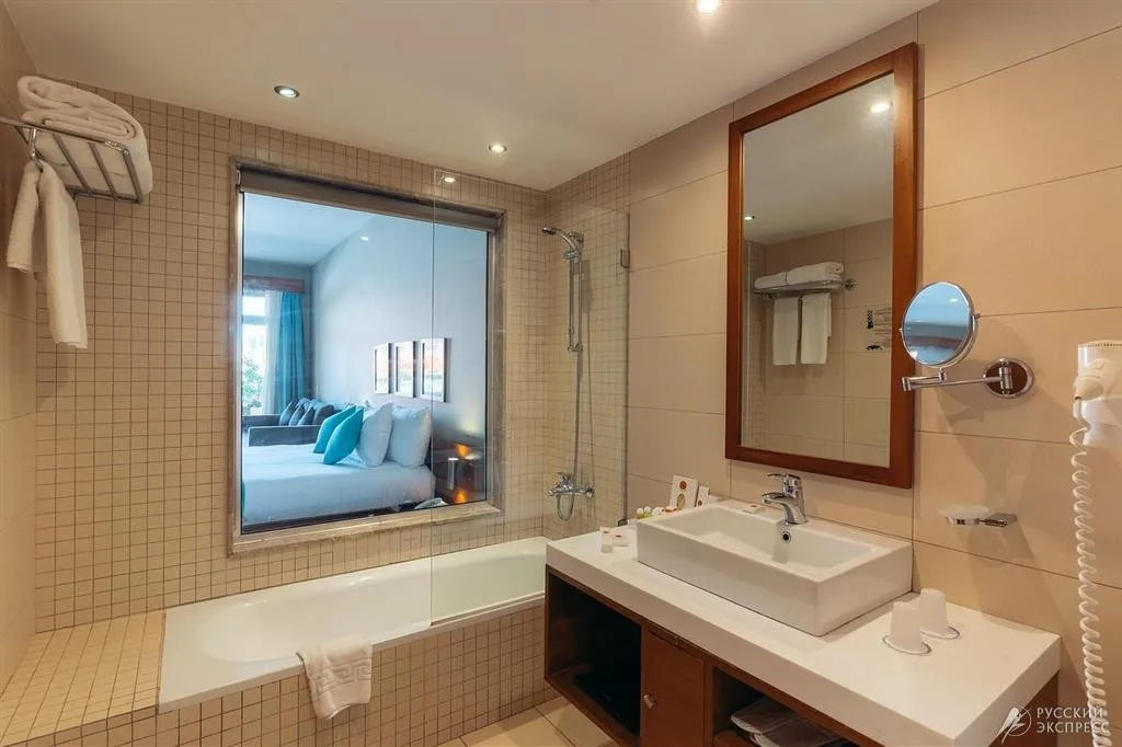 60 м2, двухкомнатный номер (есть смежная дверь), 2 односпальные кровати и двуспальная кровать, вид на бассейн/ частично на море, балкон, есть халаты, тапочки, сдвоенный умывальник, биде, 2 LCD телевизора (в каждой комнате)