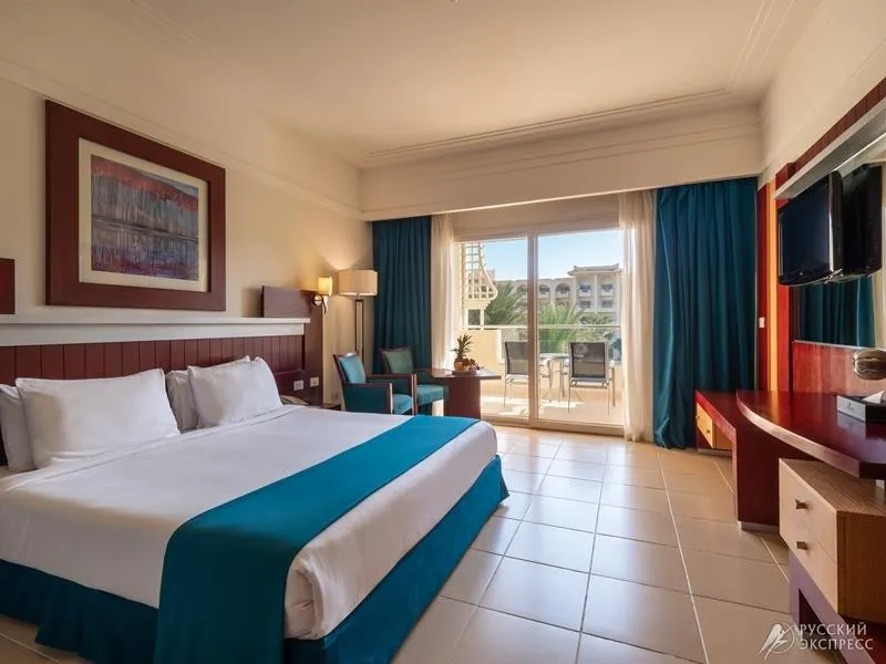 Вид из номера на бассейн, пол плитка,  кровати 1 двуспальная или 2 односпальные, в номера есть сейф и центральный кондиционер.