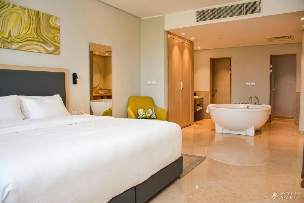 50 м2, с видом на море или поле для гольфа и меблированным балконом. В номере: king-size кровать, гостиная, софа, рабочий стол, мраморная ванная комната с двумя раковинами. Доступно посещение спа-центра, бизнес-центра и индивидуальная регистрация заезда и выезда.