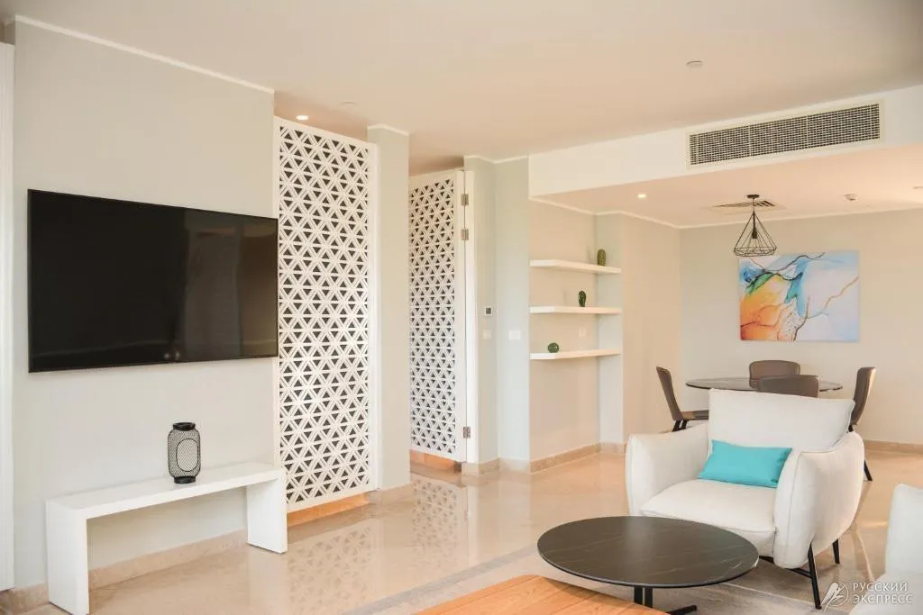 с видом на море и меблированным балконом. В номере: king-size кровать, гардеробная, гостиная, софа, рабочий стол, обеденная зона, мраморная ванная комната с двумя раковинами.