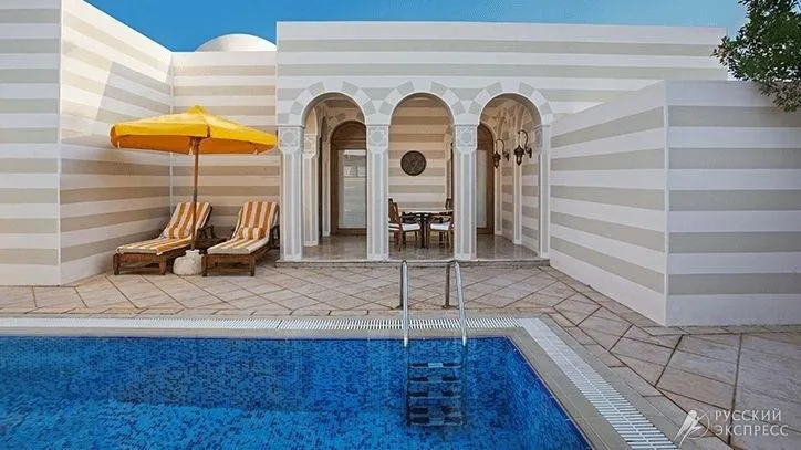 125 м2, номер с бассейном на террасе, видом на сад, гостиной, ванной в мраморной ванной комнате и спальней с кроватью king-size. Максимальное количество гостей: 2.