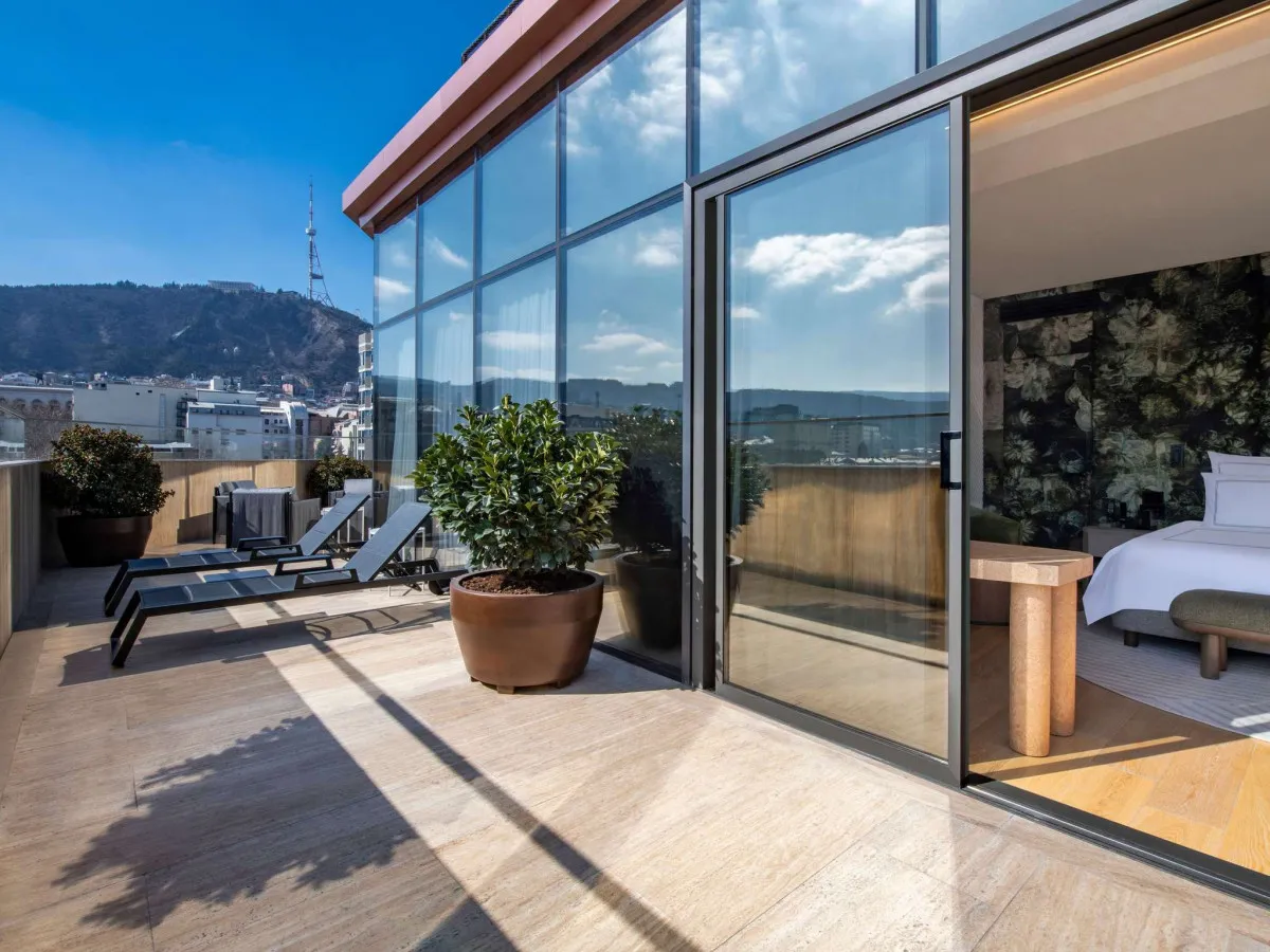 110 м2, номер с панорамным видом на Тбилиси, террасой и одной кроватью king-size. Максимальное количество гостей: 2.
