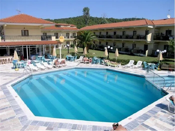 Большой бассейн смотрится, как драгоценный восьмигранный сапфир на фоне близлежащих зеленых стриженых газонов с развесистыми пальмами. А рядом детский водоем. Оба они окружены шезлонгами и яркими зонтиками от солнца, которые бесплатны. Недалеко кафе-бар, где отдыхают гости, наслаждаясь предлагаемыми им слабоалкогольными и безалкогольными напитками или вкусным мороженым и легкими закусками. Персонал отеля говорит по-русски, что очень способствует свободному общению в быту. Еженедельно в уютном кафе-баре проводятся тематические вечера, где звучит заводная греческая музыка.