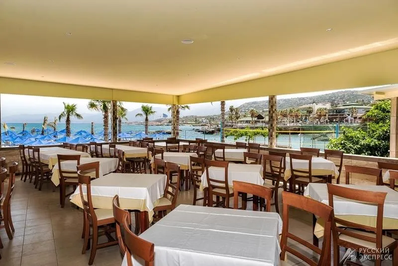 Полностью кондиционированный ресторан с 2 обеденными террасами с видом на море и великолепной греческой и интернациональной кухней.