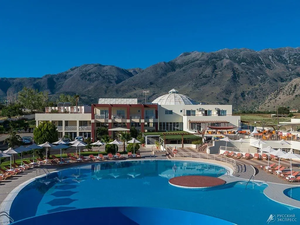 Уютная территория с бассейнами, водные горки, выбор комфортабельных номеров, рестораны, бары,спа-центр, спорт и развлечения, услуги для детей.Северное побережье острова, в 500 м от пос. Каврос, в 3 км от курортного городка Георгиуполис,  в 42 км от аэропорта Ханья, в 38 км от г. Ханья, в 98 км от г. Ираклион, в 18 км от г. Ретимно, в 4 км от курортной зоны озера Курнас. Центральное здание и комплекс бунгало. Общая территория 25.000 кв.м.