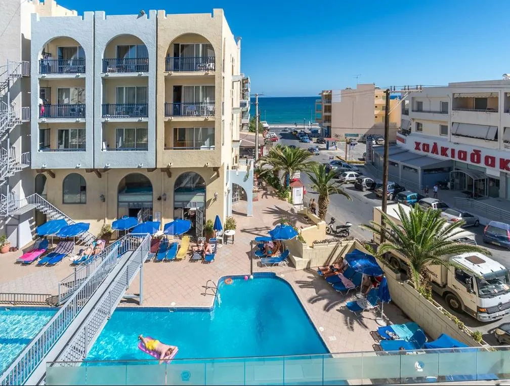 В распоряжении гостей сто четыре комфортабельных номера: стандартные, студии и апартаменты. Ненавязчивый, приятный глазу дизайн сочетает современную функциональность с красочными элементами типично критского стиля в форме и декоре мебели. Полы выстелены мраморной плиткой, на фоне беленых стен особенно изысканно смотрятся благородно-розовые и песочные оттенки текстиля. В дополнение к имеющимся во всех покоях кондиционерам, телевизорам со спутниковыми каналами, холодильникам, телефонам прямой связи, сейфам, ванным, оснащенным ваннами или душевыми кабинами и фенами, в студиях и апартаментах выделены кухонные уголки с обеденными столами, мойками для посуды и набором необходимой для готовки утвари. Огромные, практически во всю стену двери, ведут на просторные меблированные балконы, с которых открываются виды на симпатичный внутренний дворик, городские кварталы или далекий горизонт, где небо сливается с морской стихией.