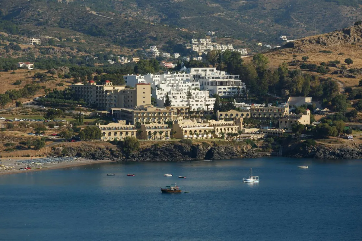 Отель Lindos Royal расположился у самого берега Средиземного моря, среди живописной гористой местности юго-восточной части острова Родос. Невысокий главный корпус и девять трехэтажных коттеджей в окружении стилизованных под средневековье зубчатых башен представляют собой замечательный архитектурный ансамбль, который превосходно вписался в окружающий ландшафт и полностью соответствует легендарному духу этого солнечного острова. Величественная колониальная архитектура со стройными, воздушными арками, черепичные крыши, мягкие песочные тона отделки и античные элементы декора все здесь напоминает о славном прошлом Родоса.