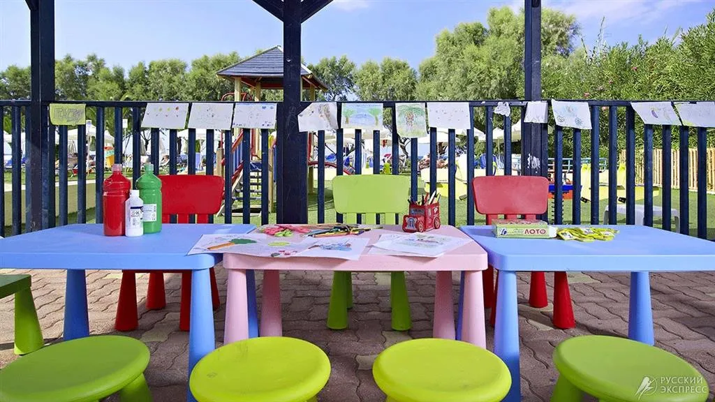 Детская площадка • Детские кроватки • Высокие стульчики • Детский бассейн • Мини-клуб (4-12 лет. (10.00-12.00 / 15.00-17.00) / раскраска лица (нетоксичными красками), игры в бассейне, детская дискотека и т.д.)
