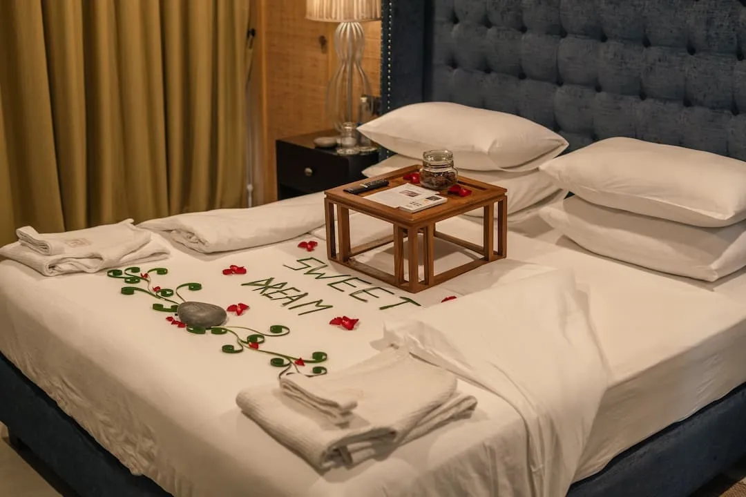 45 м2, двухместный номер с 1 большой двуспальной кроватью, бесплатными туалетно-косметическими принадлежностями, халатами и собственной ванной комнатой с ванной, душем и биде. Номер оснащен кондиционером, мини-баром, гостиным уголком, шкафом для одежды, а также телевизором с плоским экраном и потоковыми сервисами. Максимальное количество гостей: 2 взрослых