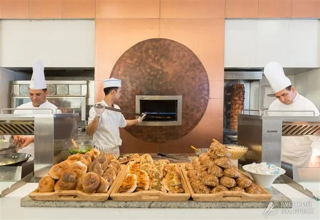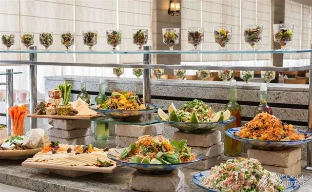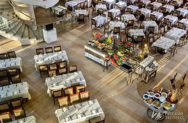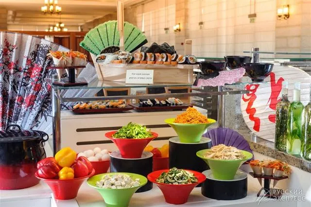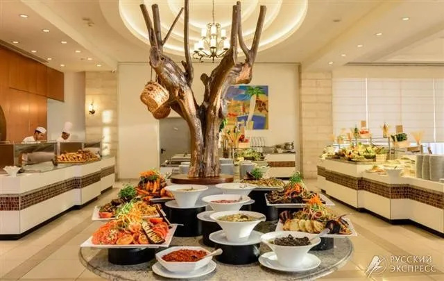 1 главный ресторан (завтраки и ужины-израильский шведский стол), лобби-бар (в обед работает как снэк-бар) , Room service с 11:00 до 23:00, многофункциональный банкетный зал вместимостью до 300 человек и 10 комнат для встреч для 50 гостей каждая