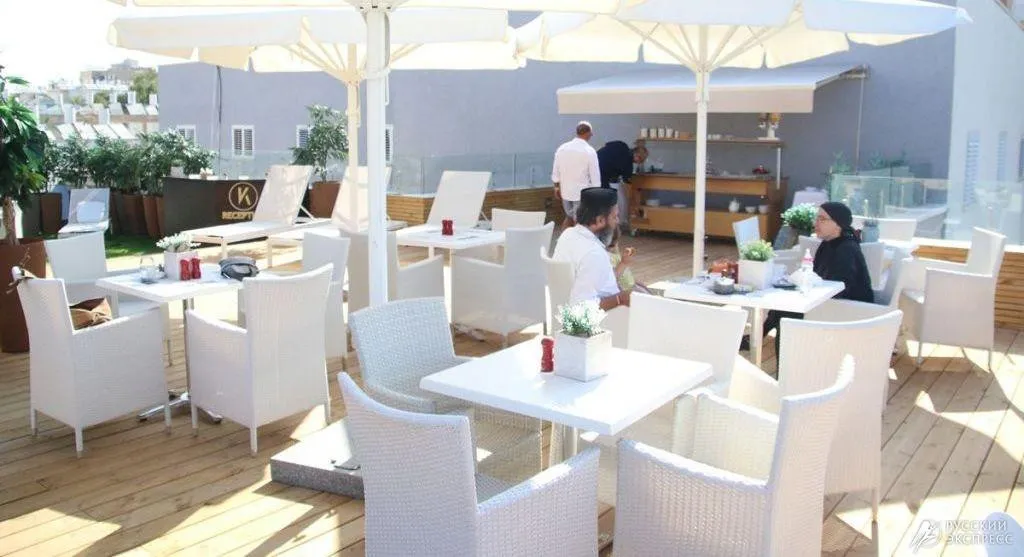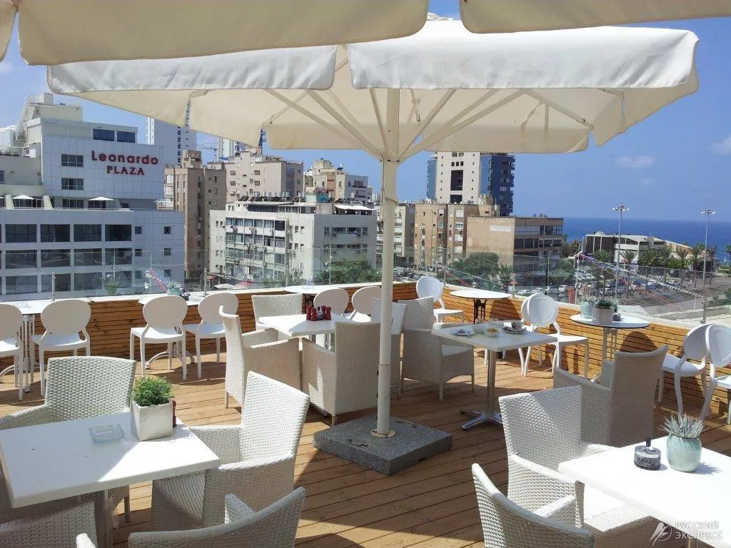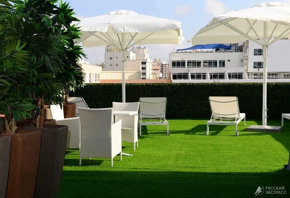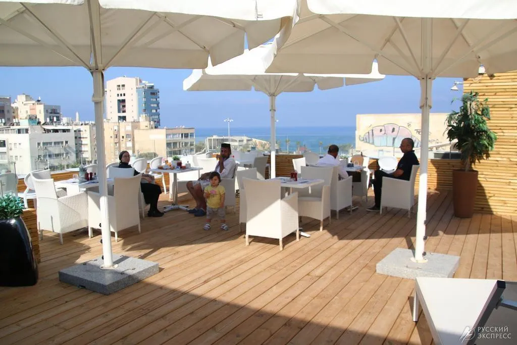 На крыше отеля солнечная терраса с прекрасным видом на город и море.