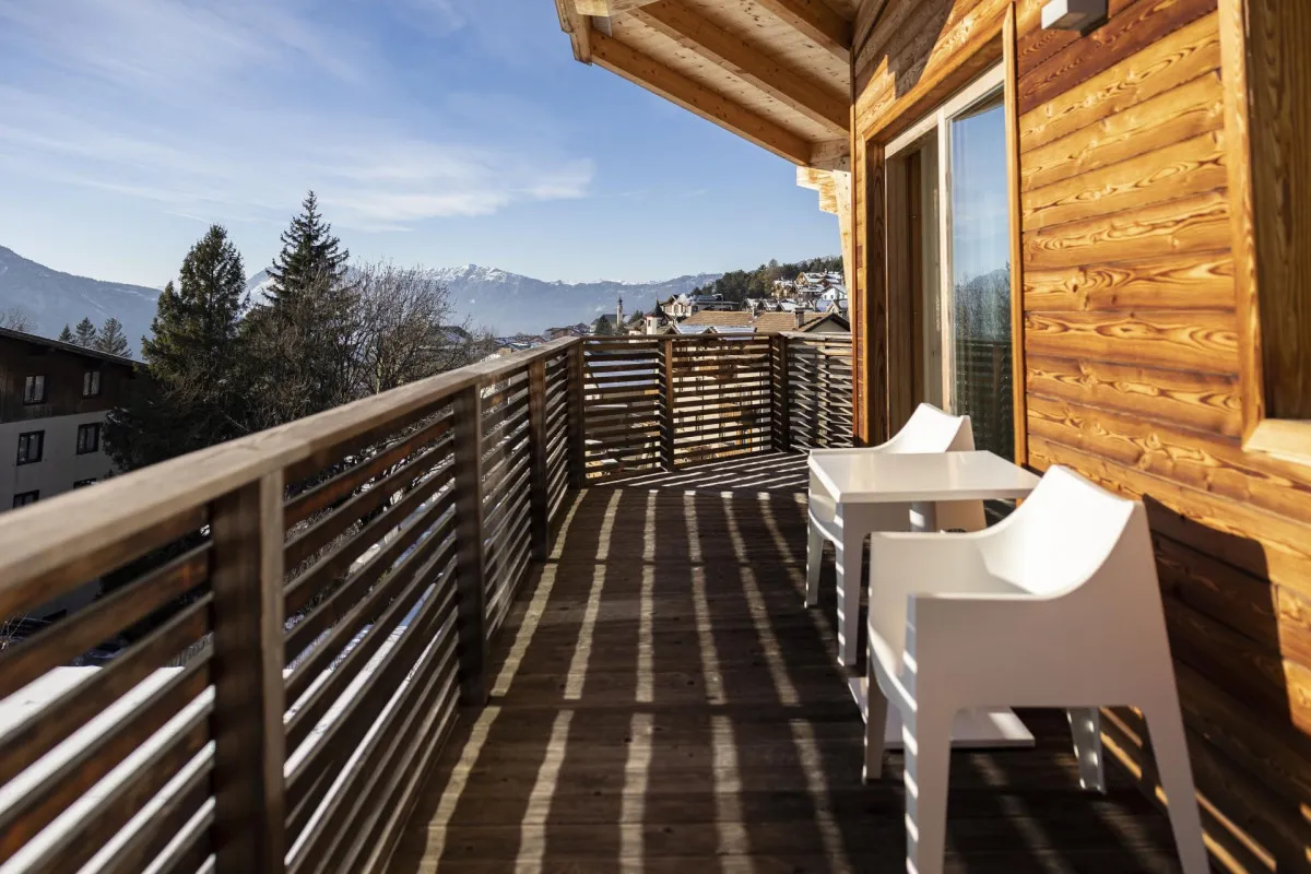 32 м2, балкон с видом на Альпы, двуспальная кровать или две односпальные кровати, гостиная с диваном, сауна