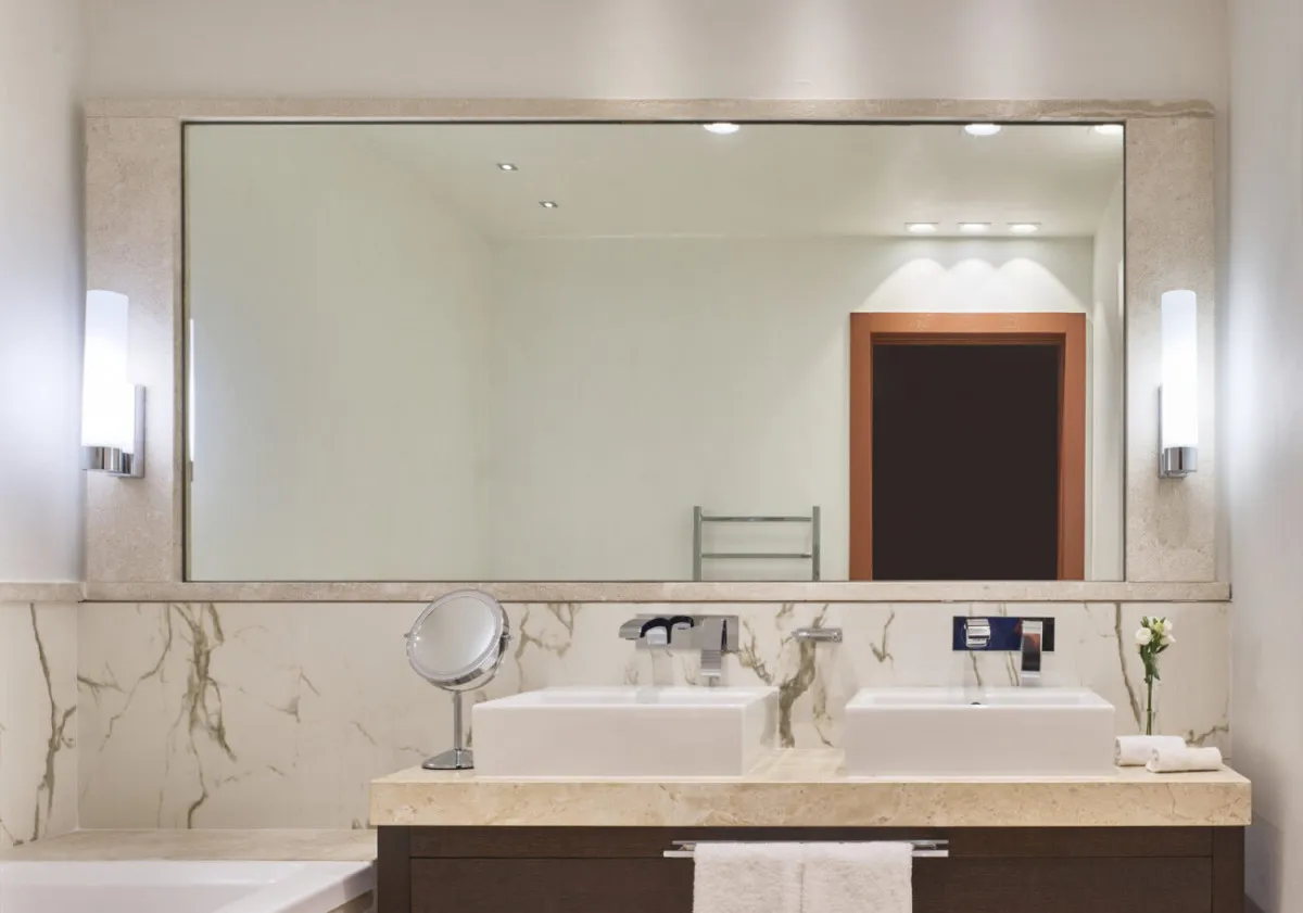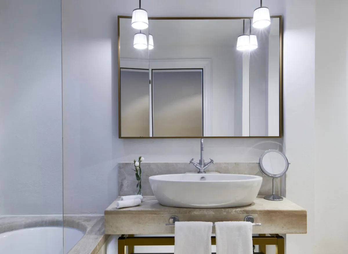 27 м2, номер расположен в верхней части склона отеля, в 5 минутах ходьбы от главного вестибюля. Ванная комната отделана природным камнем и оформлена в светлых золотистых тонах. Количество гостей: 2