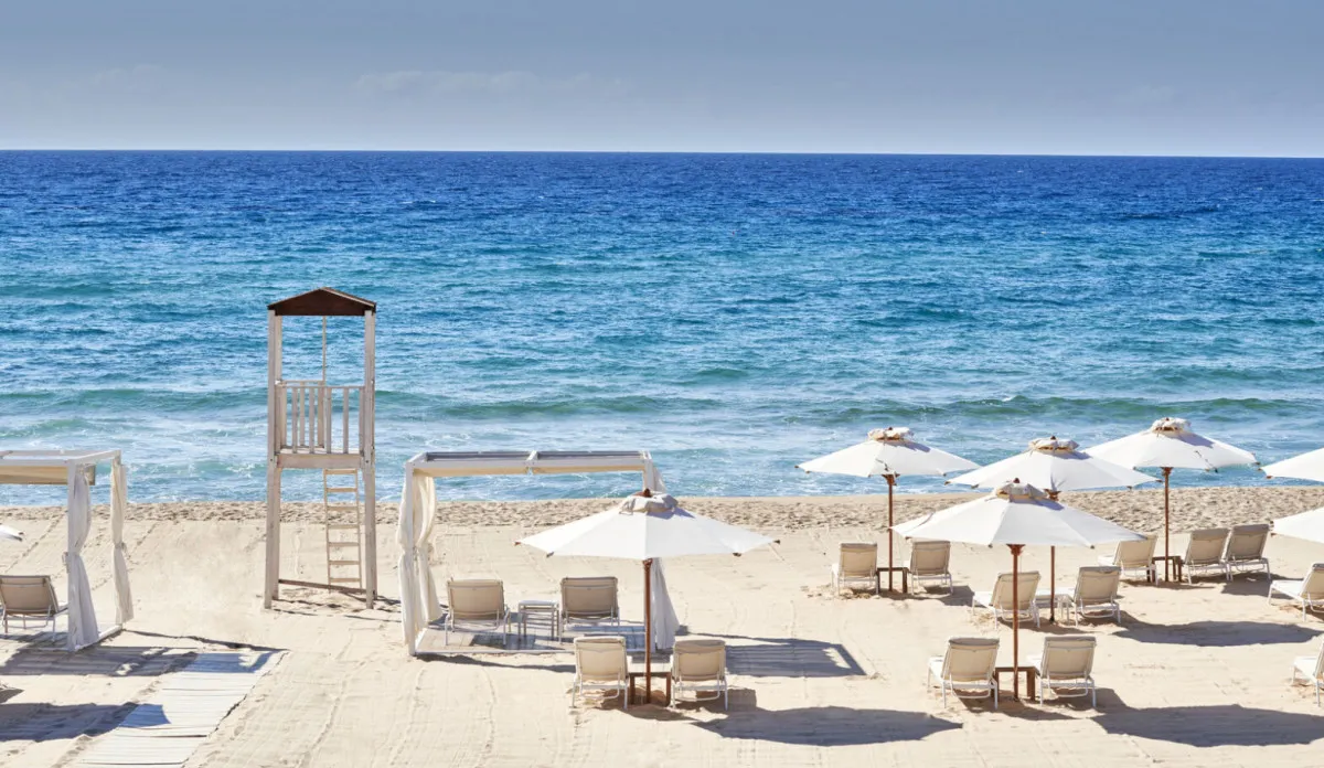 Песчаный пляж оборудован шезлонгами и зонтиками, отель предлагает частный шаттл до пляжа.