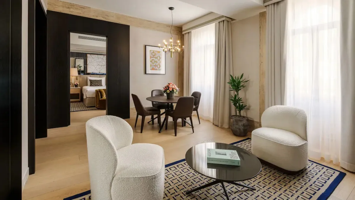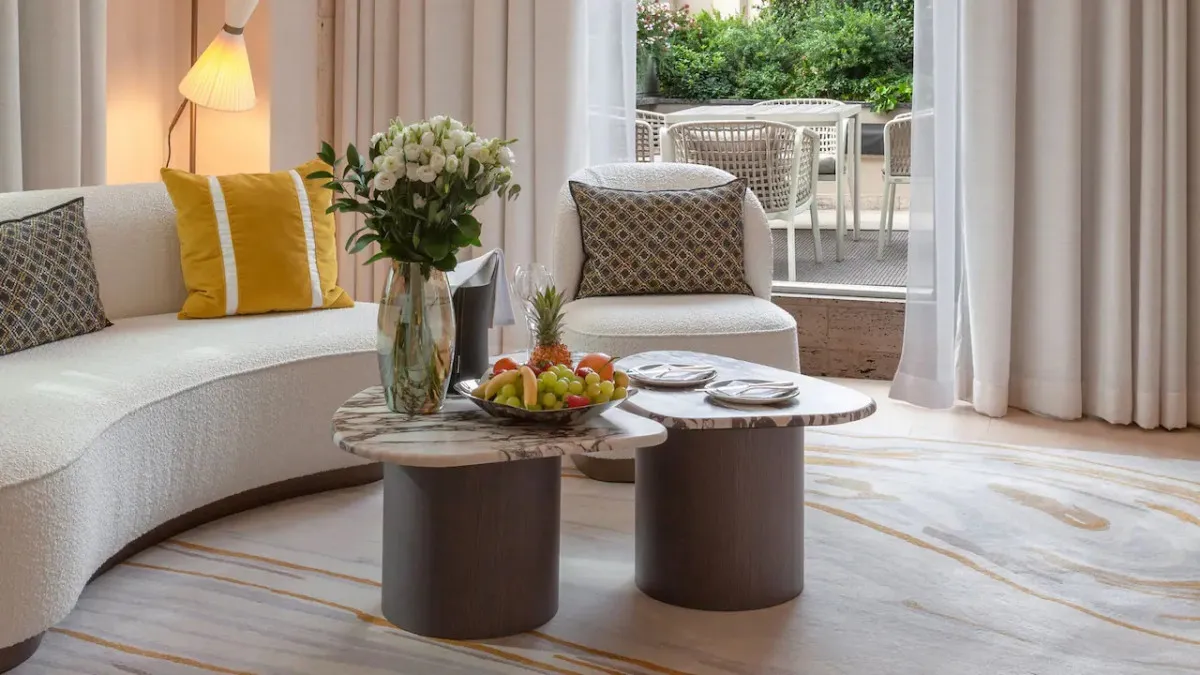 65 м2, с террасой и видом на город. В номере: спальня с кроватью king-size, гостиная, диван, стол, телевизор, обеденная зона, мраморная ванная комната с тропическим душем и ванной.