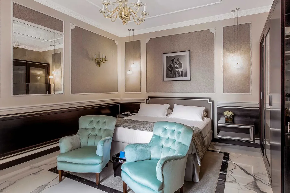 70 м2, смежный номер с видом на внутренний двор или город. В номере: две спальни, телевизор, две ванные мраморные комнаты. Максимальное количество гостей: 5.