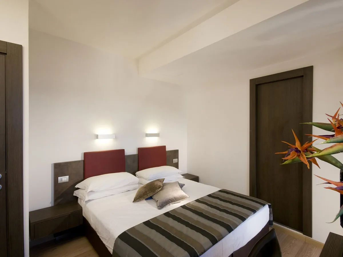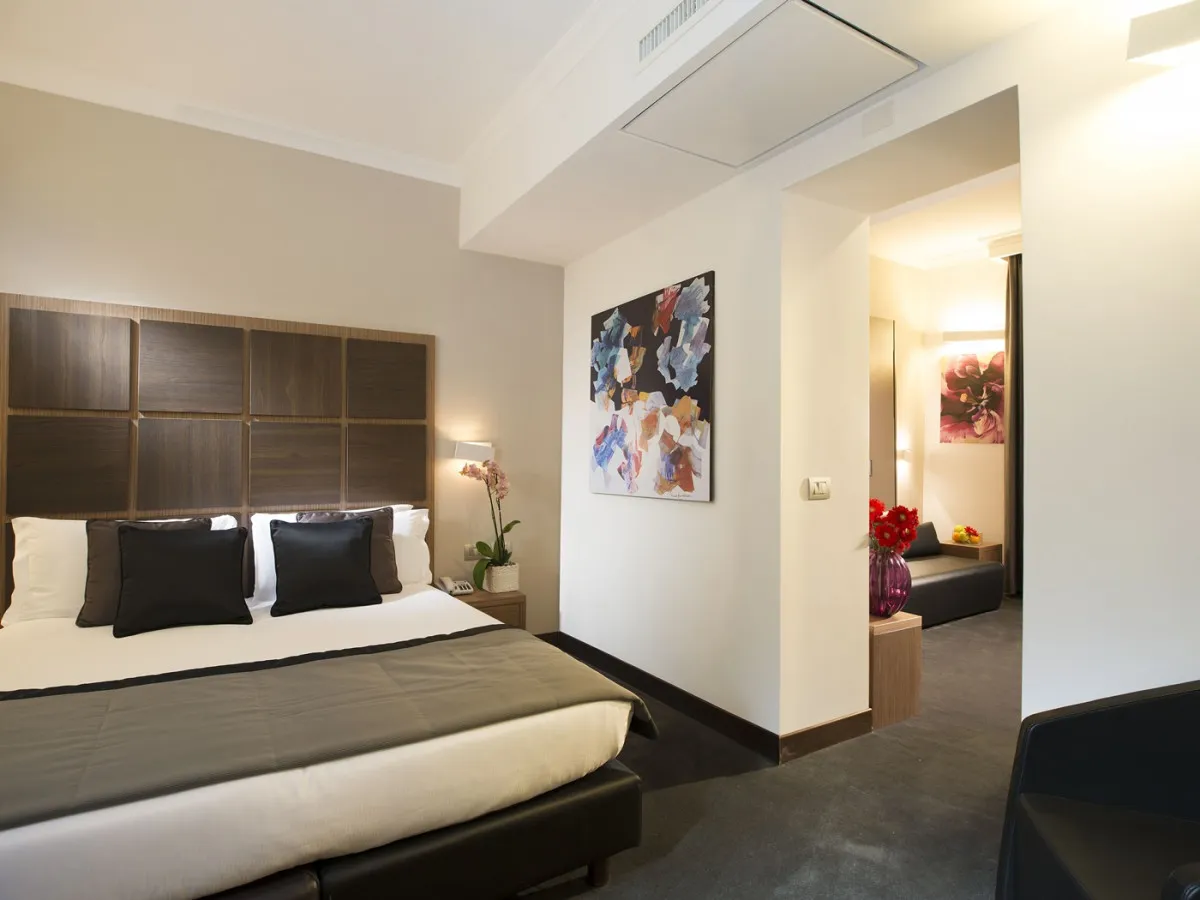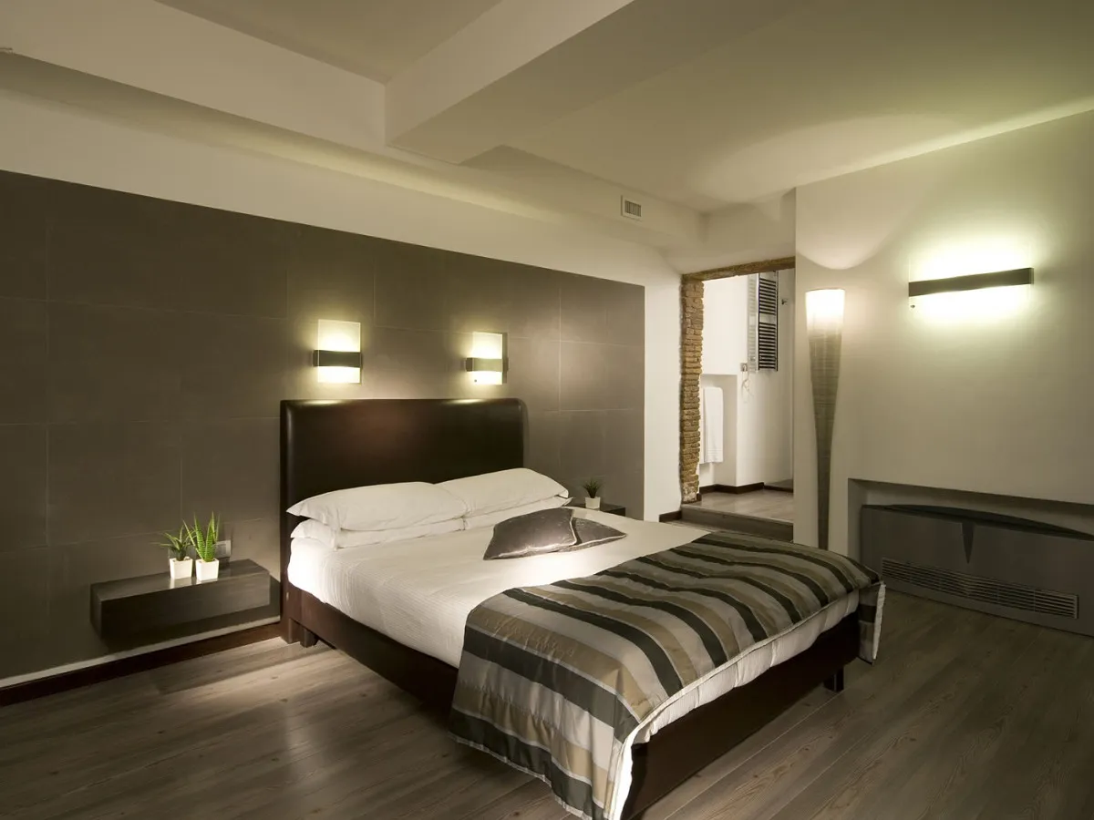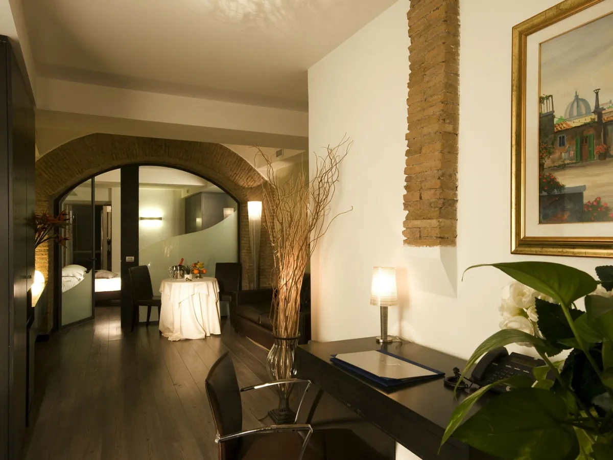 Интерьеры отеля объединяют подлинный римский характер и современный дизайн. Открытые деревянные балки, аутентичные материалы и оригинальные архитектурные детали создают атмосферу исторического Рима, дополненную чистыми линиями, продуманным освещением и спокойной палитрой натуральных оттенков, навеянных камнем и деревом. Просторные и тихие номера спроектированы с особым вниманием к деталям, обеспечивая ощущение уюта и гармонии.
