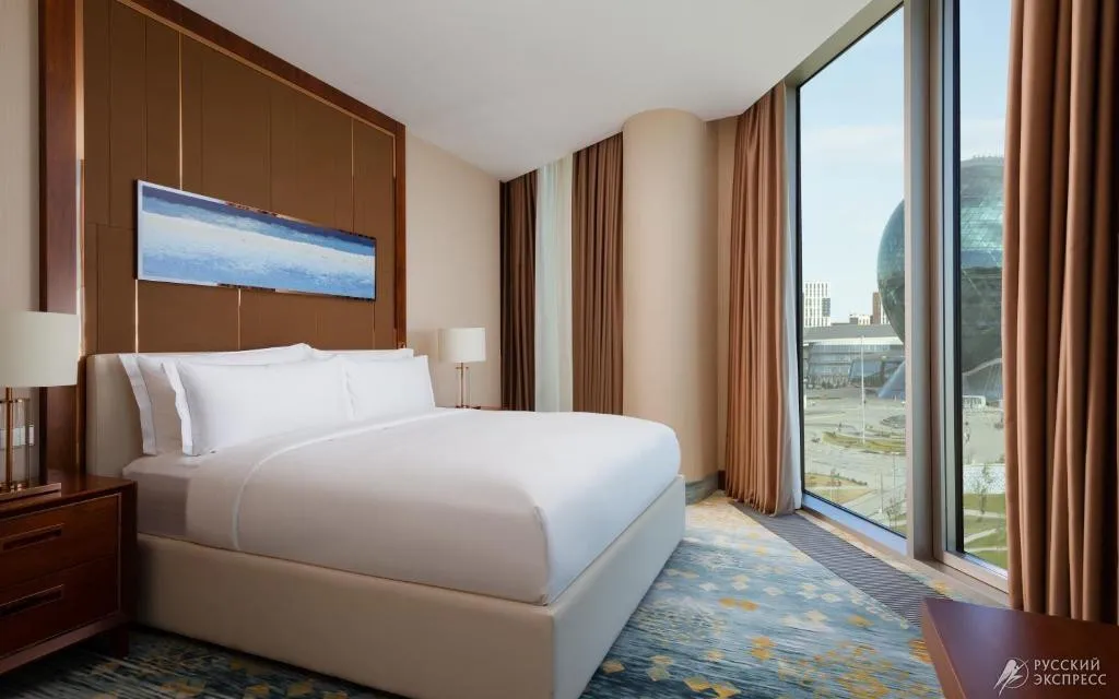 Отель находится недалеко от автомагистрали, на краю кампуса выставочного центра ЭКСПО-2017, а также в нескольких шагах от магазинов и ресторанов Mega Silk Way и в 5 км от башни Байтерек, откуда открывается панорамный вид на Нур-Султан. Для гостей отеля Hilton доступны спа-центр с саунами и турецкой баней, а также бар на крыше и крытый бассейн с подогревом.