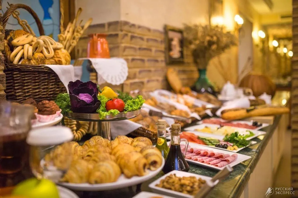 • банкетный зал — с 13:00 до 14:30, в будние дни бизнес-ланчи «Кухня народов мира». Классический стиль оформления, рассчитан на прием до 130 персон, для проведения различного рода торжеств