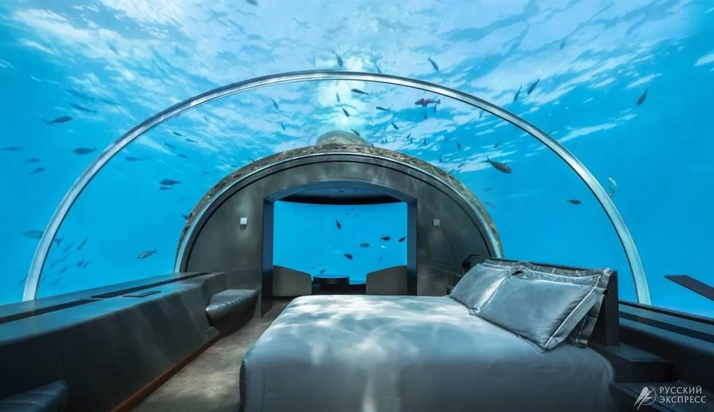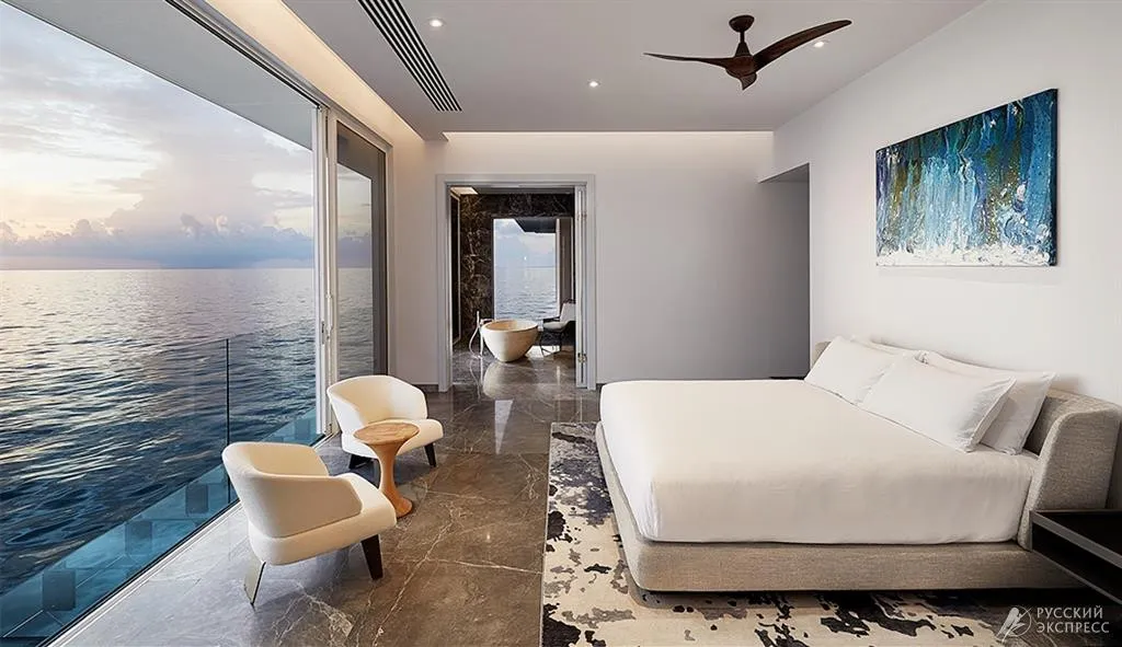 двухуровневая резиденция с уникальной архитектурой, включающая мастер-спальню, расположенную на глубине более пяти метров под уровнем моря. Верхний уровень: две спальни, гостиная и столовая зона, ванная комната с ванной с видом на океан, терраса с частным инфинити-бассейном, услуги личного батлера. Нижний уровень: подводная спальня с панорамным куполом на 180 градусов, ванная комната и гардеробная с панорамными окнами. Расположение: отдельная резиденция над и под водой. Максимальное количество гостей: 9.