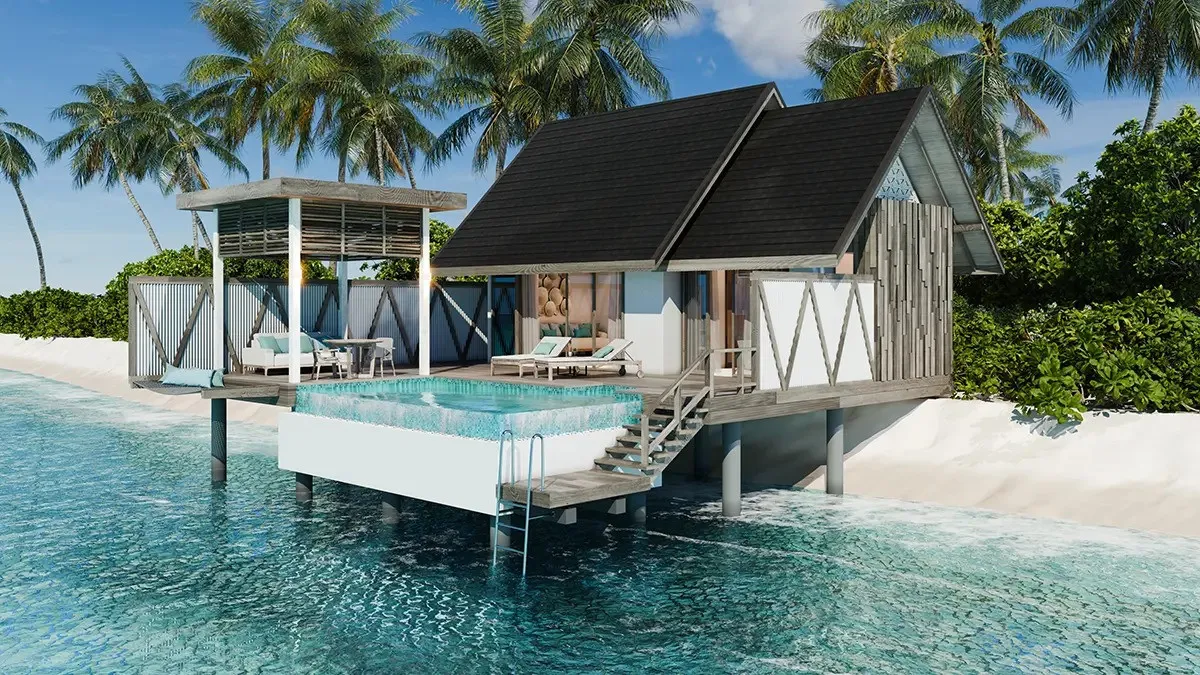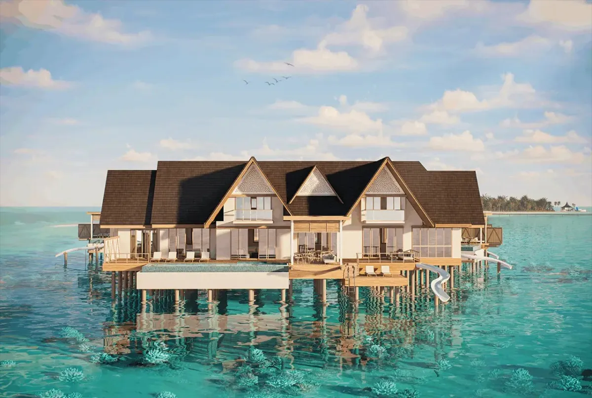 404 м2, надводная вилла с двумя спальнями, бассейном, водной горкой, зоной отдыха. Максимальное количество гостей: 4 взрослых и 2 детей.